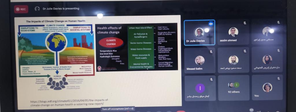 برعاية السيد رئيس جامعة الموصل الأستاذ الدكتور قصي كمال الدين الأحمدي المحترم وإشراف السيدة عميد كلية العلوم الأستاذ المساعد الدكتورة هيام عادل الطائي المحترمة .أقام قسم الطاقات الجديدة والمتجددة في كليتنا يوم السبت الموافق 22 كانون الثاني 2022 ورشة دولية للتعليم المستمر بعنوان Health, Climate change and decent work “ “ “الصحة ،تغيير المناخ وتأثيرها على سير العمل” بالتعاون مع فاكلتي استراتيجيات الصحة الدولية في جامعة لندن – المملكة المتحدة. القتها كل من بروفيسور دكتورة جولي ديفيس/ جامعة لندن /المملكة المتحدة و أ. م. د. لمياء عدنان سرسم / قسم الطاقات الجديدة والمتجددة / كلية العلوم . تضمنت الورشة ثلاث أهداف من أهداف التنمية المستدامة السبعة عشر وهم [ الهدف الثالث ” الصحة الجيدة والرفاهية ” ] , [ الهدف الثامن ” العمل اللائق ونمو الاقتصاد ” ] وأخيراً [ الهدف الثالث عشر” العمل المناخي ” ] والتي تضمنها عنوان هذه الورشة الصحة والتغير المناخي وتأثيرهم على سير العمل ومنهجية التعليم الاكاديمي لتدريب وتهيئة الجيل الجديد من الطلاب وما سيواجههم من تحديات مناخية وبيئية وكيفية الحد من تأثيرات التغيرات المناخية على المعمورة إن ما تطالب به أهداف التنمية المستدامة السبعة عشر من إحداث تحوّلات جذرية في النظم الاجتماعية , المالية ,الاقتصادية والسياسية التي تحكم مجتمعاتنا اليوم، وذلك لضمان حقوق الإنسان للجميع اينما كانوا وتتطلب هذه الأهداف إرادة سياسية كبيرة وإجراءات طموحة يتخذها أصحاب القرار والمصلحة جميعهم.حضرها جمع غفير من أساتذة جامعة الموصل بمختلف اختصاصاتهم بالإضافة إلى أساتذة من الجامعات العراقية والأجنبية .