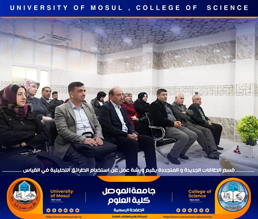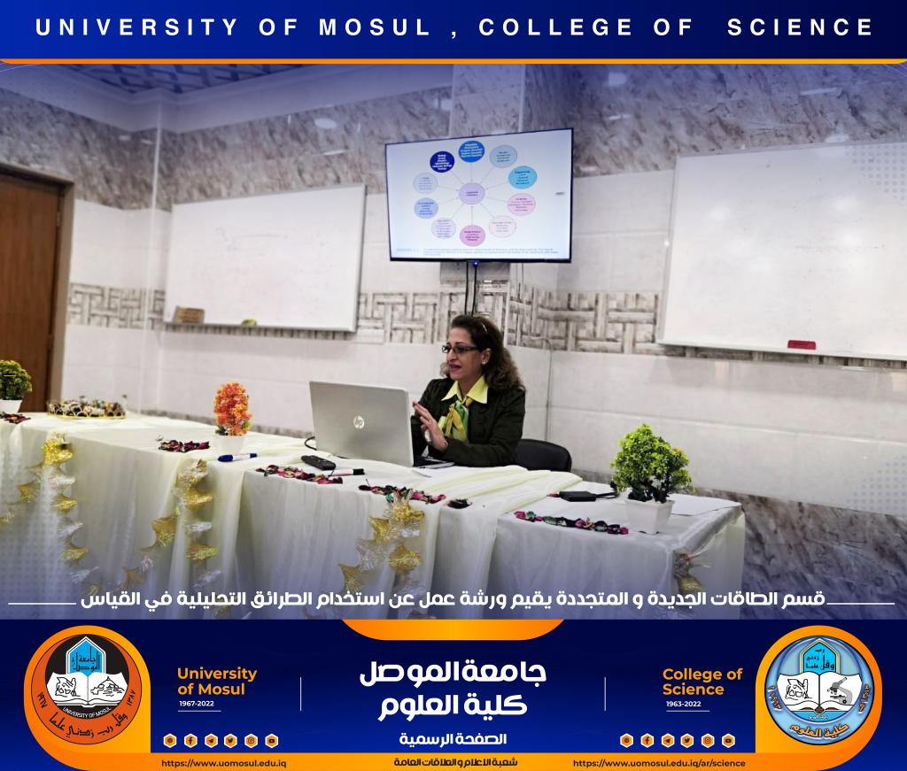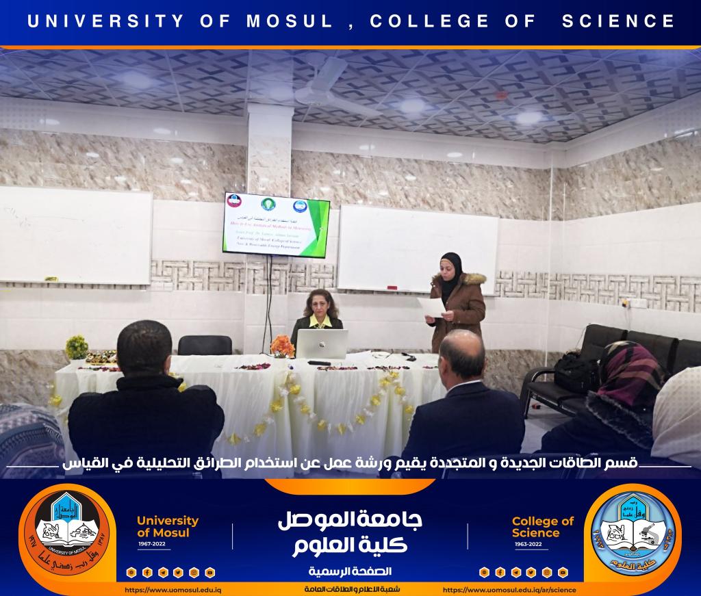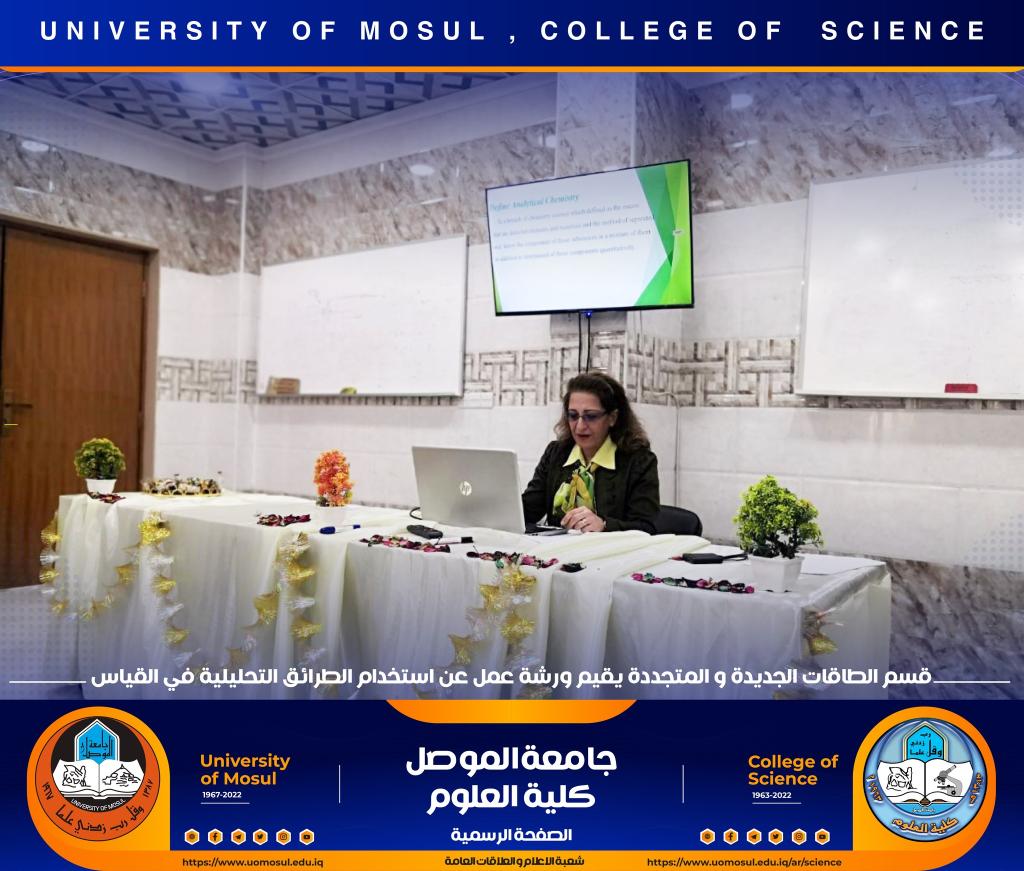 برعاية السيد رئيس جامعة الموصل الأستاذ الدكتور قصي كمال الدين الأحمدي وبإشراف السيدة عميد كلية العلوم الأستاذ الدكتورة هيام عادل إبراهيم ، أقام قسم الطاقات الجديدة والمتجددة في كليتنا ورشة عمل بعنوان ” كيفية استخدام الطرائق التحليلية في القياس ” وذلك صباح يوم الثلاثاء الموافق 6 كانون الأول 2022 في رحاب القاعة الالكترونية للقسم ، حضرها السيد رئيس القسم وعدد من تدريسي و طلبة القسم ، كما ألقى محاضراتها الأستاذ المساعد الدكتورة لمياء عدنان سرسم.تضمنت الورشة التعريف بالكيمياء التحليلية وعلاقتها مع باقي فروع الكيمياء وبقية أنواع العلوم والاختصاصات مثل الاختصاصات الطبية والهندسة والزراعية والمجتمعية.هدفت الورشة الى التعريف بكيفية استخدام الطرائق التقليدية في التحليل مثل التحليل الحجمي والتحليل الوزني إضافة إلى الطرائق الآلية من ضمنها الطرائق الطيفية وكيفية إجراء التجارب بواسطة هذه الطرائق المختلفة.شعبة الإعلام والعلاقات العامةالثلاثاء 6 كانون الأول 2022