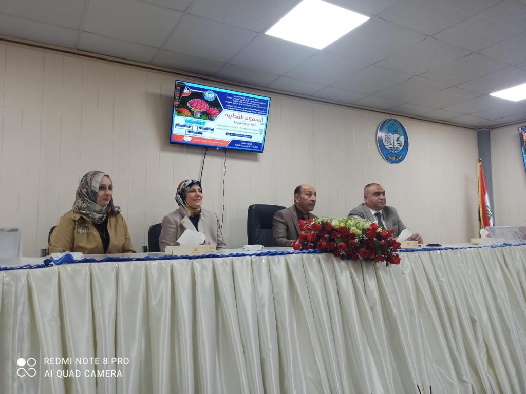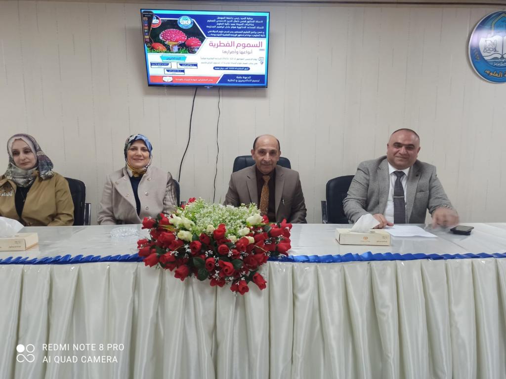 برعاية السيد رئيس جامعة الموصل الأستاذ الدكتور قصي كمال الدين الأحمدي المحترم وإشراف السيدة عميد كلية العلوم الأستاذ المساعد الدكتور هيام عادل الطائي المحترمة وبحضور رئيس القسم الاستاذ المساعد الدكتور رائد سالم الصفار أقيمت في قسم علوم الحياة صباح اليوم الخميس الموافق 2 كانون الأول 2021 ورشة عمل ضمن نشاطات التعليم المستمر و الموسومة ” السموم الفطرية انواعها وأضرارها ” ألقاها كلا من أ. م. د. مها اكرم الرجبو و م . د. بادية عبد الرزاق و م. د. علاء حسين على قاعة المرحوم أ. د محمود الحاج قاسم .تضمنت الورشة الحديث عن ماهية السموم الفطرية انواعها والية عملها ومصدرها اي الفطريات الفارزة لها والظروف المساعدة والمشجعة للفطريات التي تمكنها من افراز هذه السموم في المواد الغذائية وكذلك جرى التطرق الى ميكانيكية عمل هذه السموم داخل الجسم واضرارها على الصحة العامة وكيفية الوقاية من التسمم بها والفطريات الفارزة لها.حضرها مجموعة مختلفة من تدريسي كلية العلوم بالإضافة الى طلبة الدراسات الأولية والعليا.
