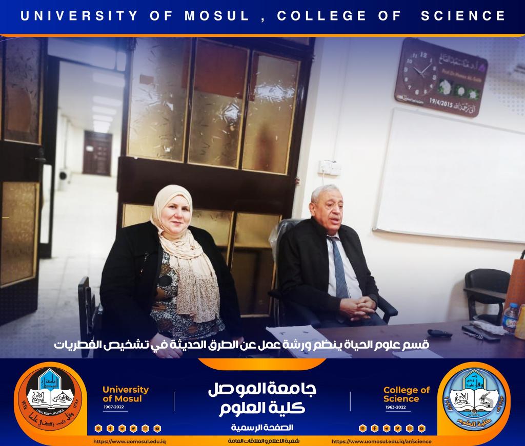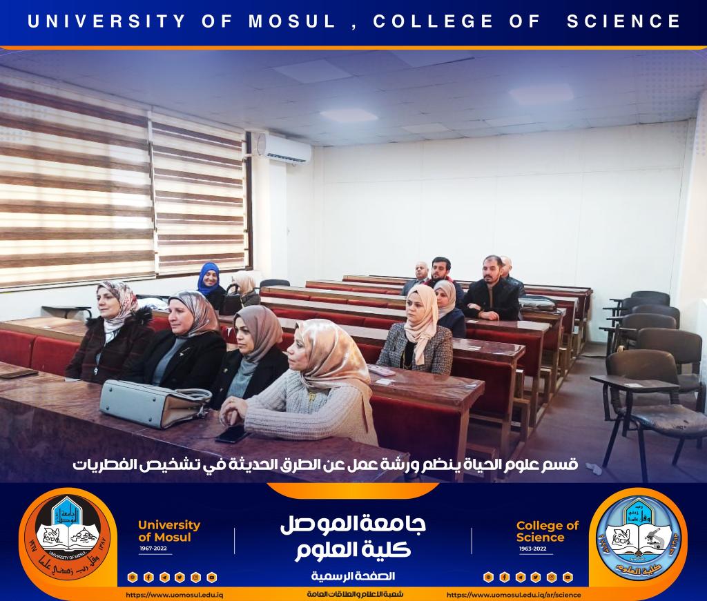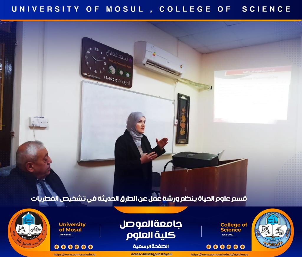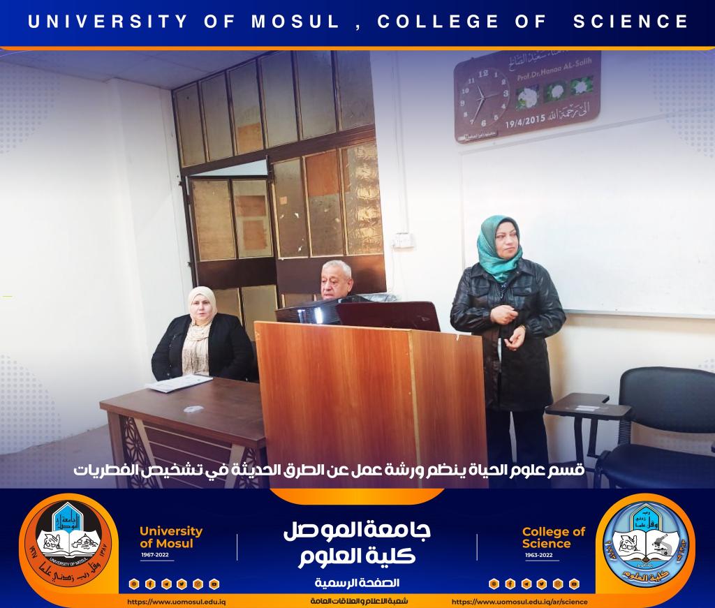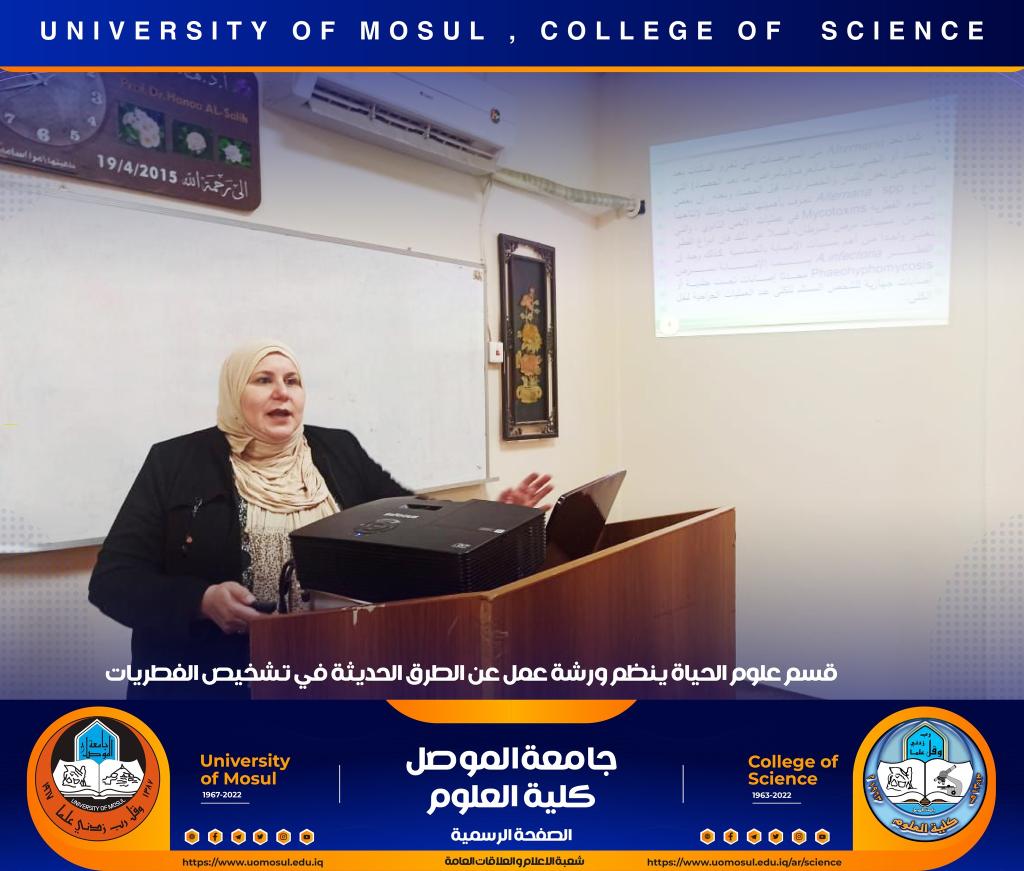 برعاية السيد رئيس جامعة الموصل الأستاذ الدكتور قصي كمال الدين الأحمدي وبإشراف السيدة عميد كلية العلوم الأستاذ الدكتورة هيام عادل إبراهيم ، أقام قسم علوم الحياة في كليتنا ورشة عمل بعنوان ” الطرق الحديثة في تشخيص الفطريات‟ وذلك صباح يوم الأربعاء الموافق 21 كانون الأول 2022 على قاعة الدكتورة هناء الصالح في القسم حضرها عدد من التدريسين وطلبة الدراسات العليا من داخل وخارج جامعة الموصل.تضمنت الورشة أربعة محاور :اشتمل المحور الأول على التعريف بالمفاتيح التشخيصية للفطريات Aspergillus و Alternaria و Fusarium وأهمية هذه الفطريات وطرق تشخيص الأنواع التابعة لها قدّمه الأستاذ الدكتور نديم أحمد رمضان.أما المحور الثاني فتضمن أهمية الفطر Aspergillus والأمراض التي يسببها وطرق تشخيص الأنواع التابعة له مظهرياً باستخدام أوساط غذائية محددة هي وسط CYA و MEA وتشابك دوكس بدرجات حرارية مختلفة ومجهرياً بملاحظة شكل الكونيدات قدّمته الأستاذ المساعد الدكتورة فاتن نوري عبد.في حين تطرق المحور الثالث الى أهمية الفطر Alternaria والأمراض التي يسببها ودورة حياة المرض على النباتات وأهم الصفات المميزة للفطر وطرق تشخيص الأنواع التابعة له مظهرياً في الأطباق ومجهرياً عن طريق ملاحظة شكل الكونيدات وأجزاءها بمحاضرة قدّمتها الأستاذ المساعد الدكتورة ورقاء سعيد قاسم.و تطرّق المحور الرابع الى أهمية الفطر Fusarium وطرق تشخيص الأنواع التابعة له مظهرياً في الأطباق ومجهرياً بملاحظة شكل الكونيدات التي يكونها واستخدام تقنية PCR في تأكيد التشخيص المظهري والمجهري للفطر بالإضافة إلى خطوات التشخيص الجزيئي التي تتضمن تحديد الجين الهدف وتصميم البواديء وغيرها لحين الوصول إلى تحديد التتابع النيوكليوتيدي للقطع المصخمة بالاعتماد على تقنية DND sequencing ومطابقة التسلسلات الخاصة بالجينات مع تسلسلات الجينات في موقع NCBI وتحليل النتائج وتسجيل العزلات في MCBIمن خلال محاضرة قدّمتها الأستاذ المساعد الدكتورة هديل أحمد العامري.شعبة الإعلام والعلاقات العامةالسبت 24 كانون الأول 2022