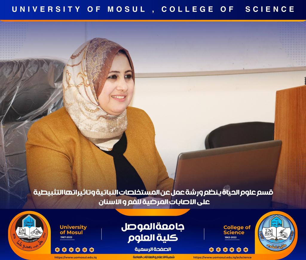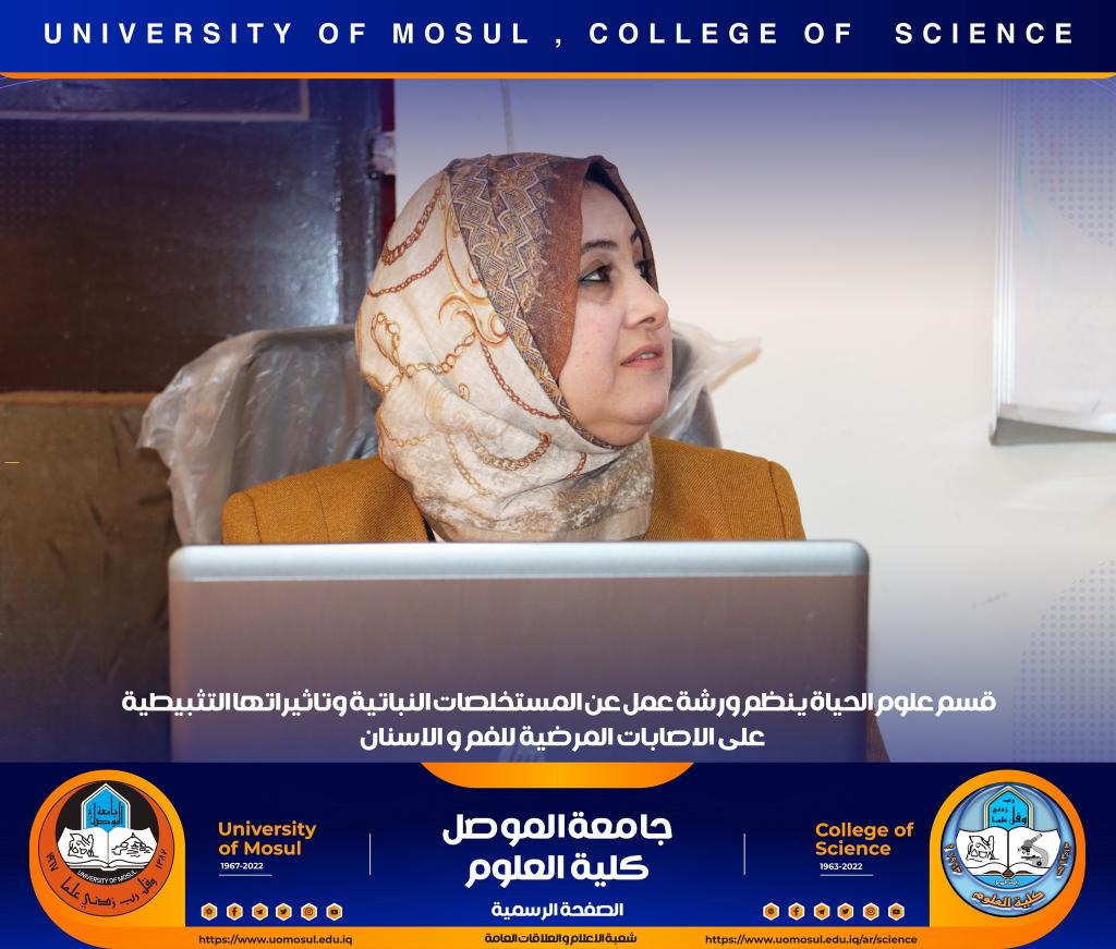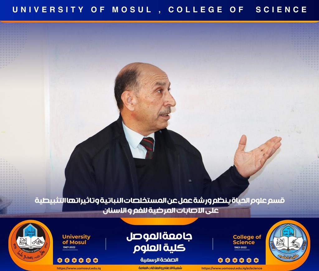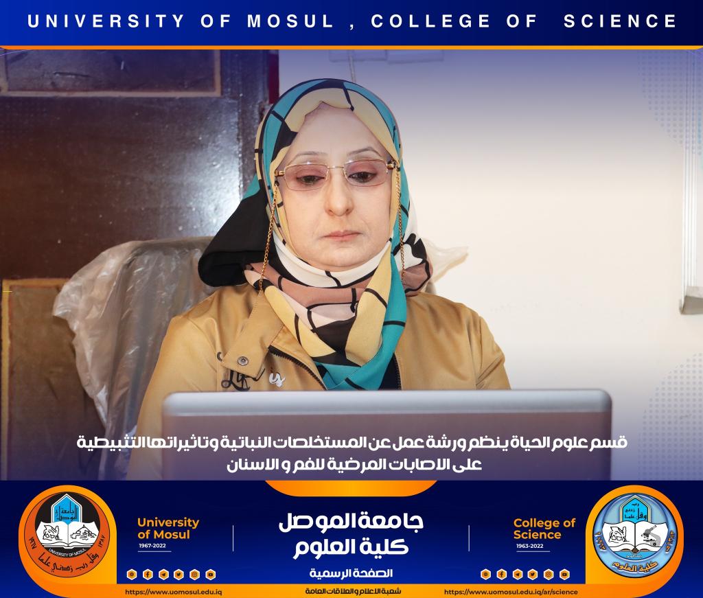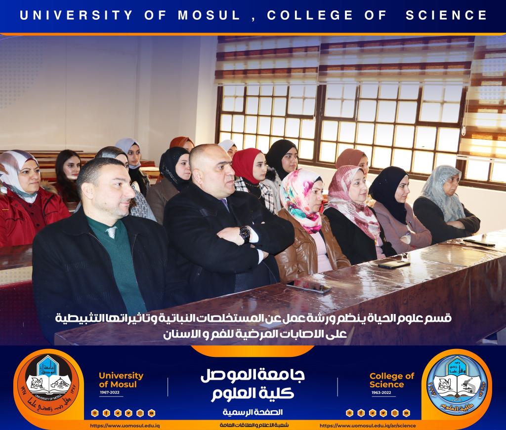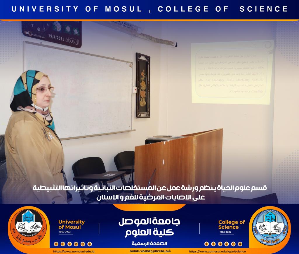 برعاية السيد رئيس جامعة الموصل الأستاذ الدكتور قصي كمال الدين الأحمدي المحترم وبإشراف السيدة عميد كلية العلوم الأستاذ الدكتورة هيام عادل إبراهيم المحترمة ، أقام قسم علوم الحياة في كليتنا ورشة عمل بعنوان ” المستخلصات النباتية وتأثيراتها التثبيطية على الاصابات المرضية للفم والاسنان ” صباح يوم الثلاثاء الموافق 27 كانون الأول 2022، حضرها عدد من التدريسين و الطلبة .تضمنت الورشة عدد من المحاضرات :- المحاضرة الاولى : أ.م.د. رائد سالم الصفار كلية العلوم / جامعة الموصل ( مقدمة عن الورشة ) ومحاورها .- المحاضرة الثانية : أ.م.د. وسن صالح حسين كلية العلوم / جامعة الموصل ( المستخلصات النباتية معجزات صغيرة للطبيعة) بينت تعريف المستخلصات المائية وأنواعها وأهميتها وبعض النباتات الطبية المستخدمة في علاج أمراض الفم والأسنان.- المحاضرة الثالثة : أ.م.د. بادية عبد الرزاق جمال كلية العلوم / جامعة الموصل ( فطريات التي تصيب الفم والأسنان ) شملت المحاضرة تعريف عن أهم الفطريات التي تصيب الفم والاسنان.- المحاضرة الرابعة : د. وئام صالح حسين طبيبة أسنان / دائرة صحة نينوى(Mycotic infections of the oralوتضمنت محاضرتها أهم الاصابات الفطرية التي تصيب الفم وأعراضها وطرق الوقاية منها والأدوية المستخدمة في العلاج.شعبة الإعلام و العلاقات العامةالثلاثاء 27 كانون الأول 2022