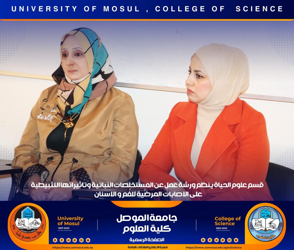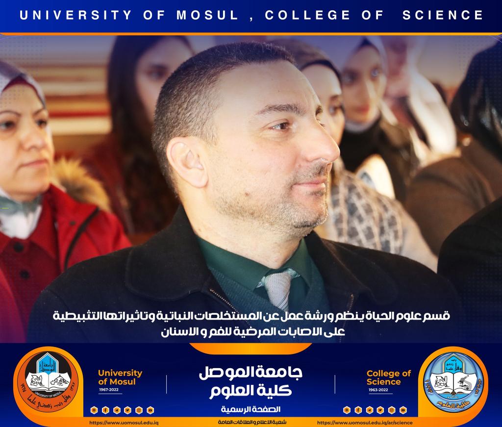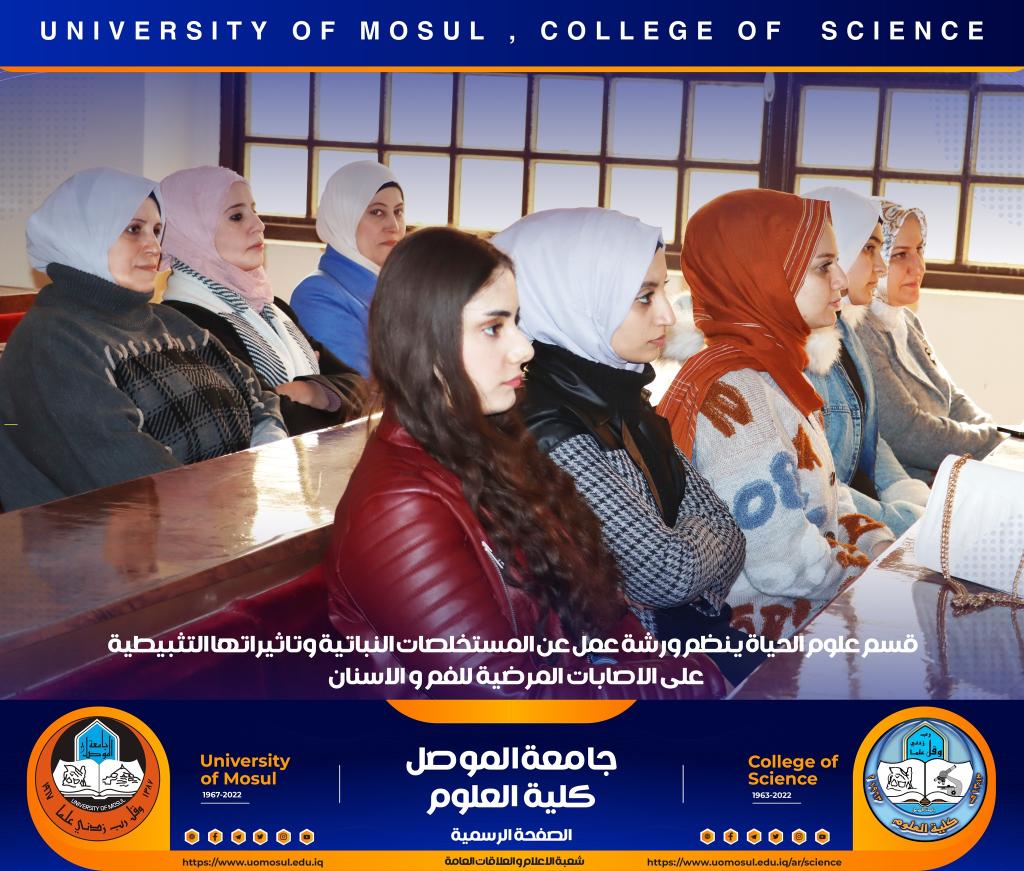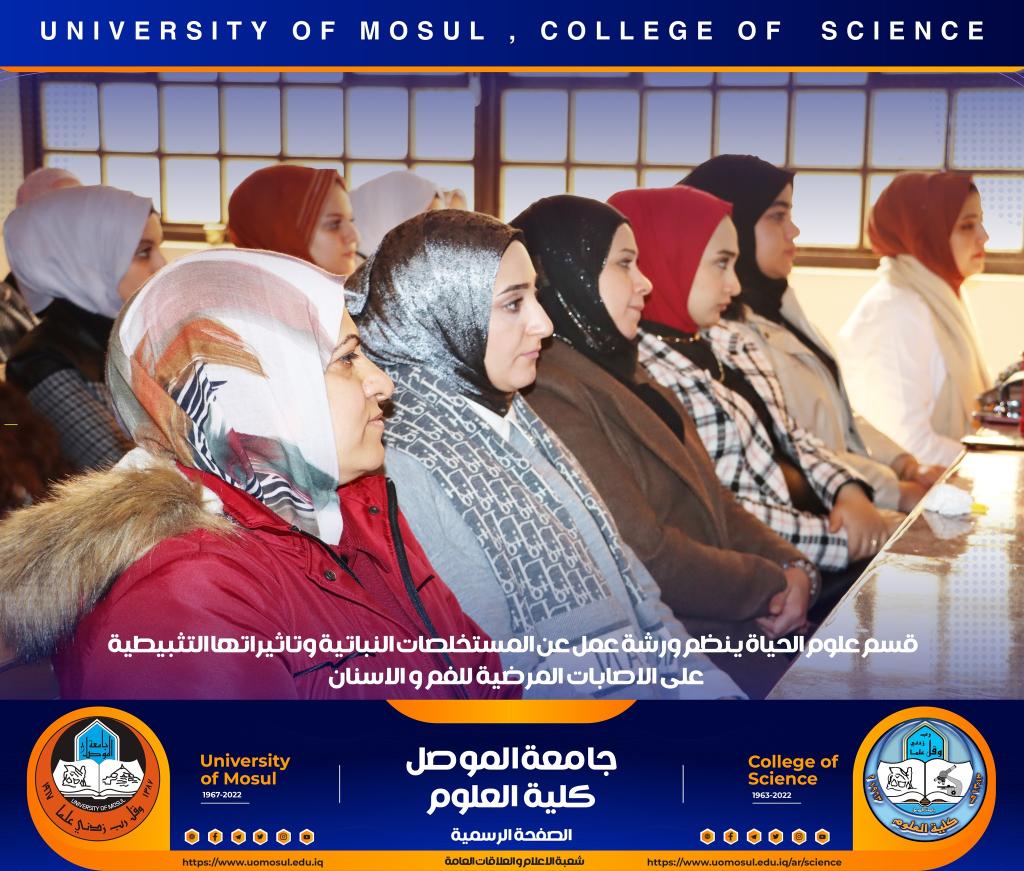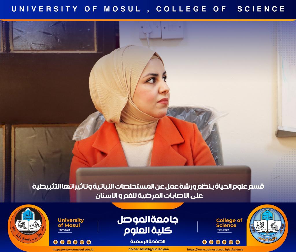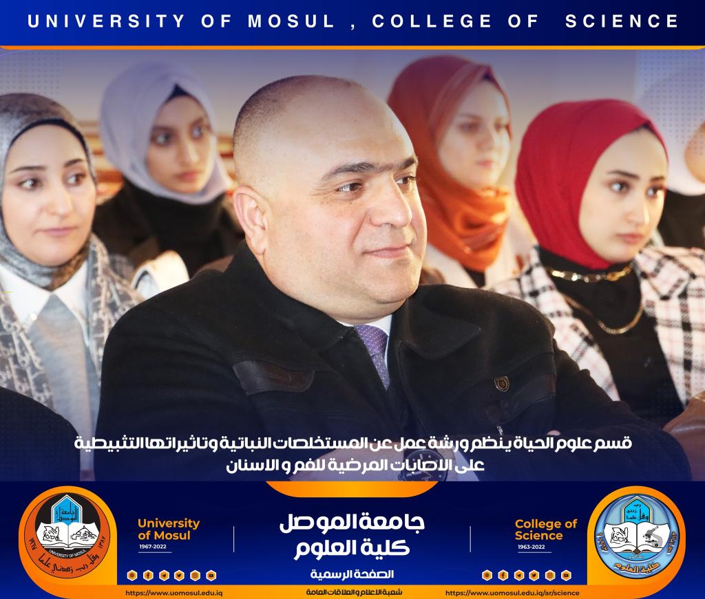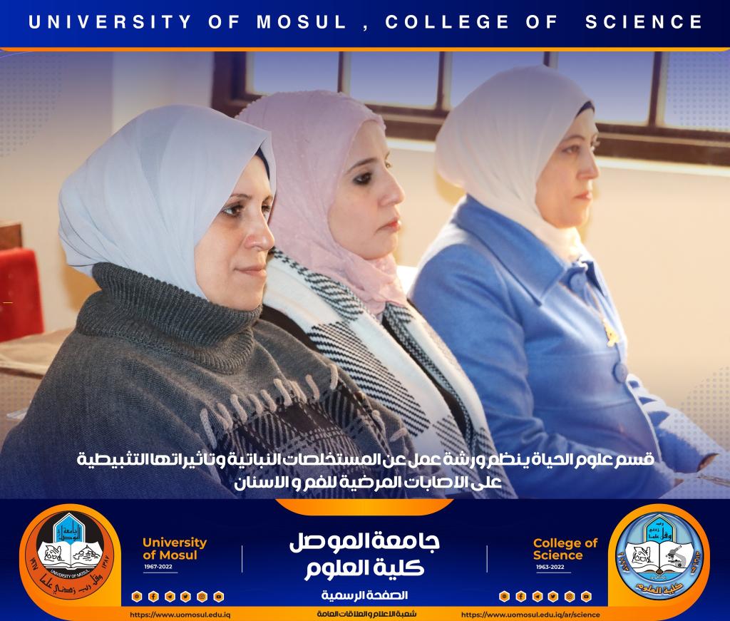 برعاية السيد رئيس جامعة الموصل الأستاذ الدكتور قصي كمال الدين الأحمدي المحترم وبإشراف السيدة عميد كلية العلوم الأستاذ الدكتورة هيام عادل إبراهيم المحترمة ، أقام قسم علوم الحياة في كليتنا ورشة عمل بعنوان ” المستخلصات النباتية وتأثيراتها التثبيطية على الاصابات المرضية للفم والاسنان ” صباح يوم الثلاثاء الموافق 27 كانون الأول 2022، حضرها عدد من التدريسين و الطلبة .تضمنت الورشة عدد من المحاضرات :- المحاضرة الاولى : أ.م.د. رائد سالم الصفار كلية العلوم / جامعة الموصل ( مقدمة عن الورشة ) ومحاورها .- المحاضرة الثانية : أ.م.د. وسن صالح حسين كلية العلوم / جامعة الموصل ( المستخلصات النباتية معجزات صغيرة للطبيعة) بينت تعريف المستخلصات المائية وأنواعها وأهميتها وبعض النباتات الطبية المستخدمة في علاج أمراض الفم والأسنان.- المحاضرة الثالثة : أ.م.د. بادية عبد الرزاق جمال كلية العلوم / جامعة الموصل ( فطريات التي تصيب الفم والأسنان ) شملت المحاضرة تعريف عن أهم الفطريات التي تصيب الفم والاسنان.- المحاضرة الرابعة : د. وئام صالح حسين طبيبة أسنان / دائرة صحة نينوى(Mycotic infections of the oralوتضمنت محاضرتها أهم الاصابات الفطرية التي تصيب الفم وأعراضها وطرق الوقاية منها والأدوية المستخدمة في العلاج.شعبة الإعلام و العلاقات العامةالثلاثاء 27 كانون الأول 2022
