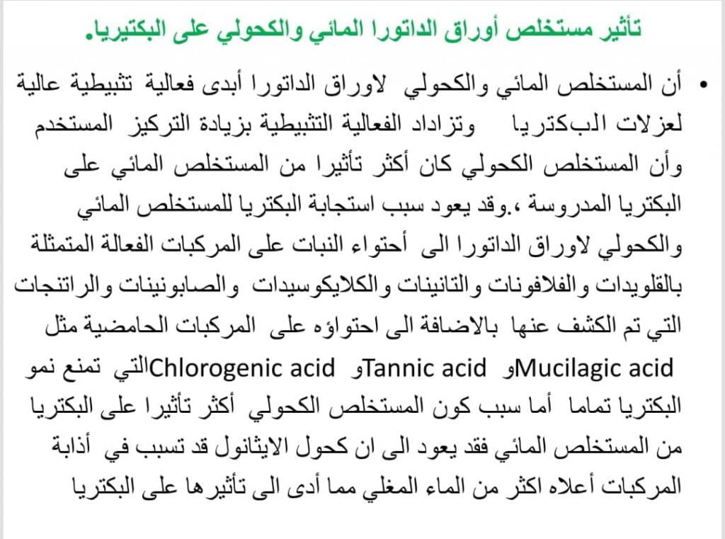 برعاية السيد رئيس جامعة الموصل الأستاذ الدكتور قصي كمال الدين الأحمدي وبإشراف السيدة عميد كلية العلوم الأستاذ الدكتورة هيام عادل إبراهيم و متابعة السيد رئيس قسم علوم الحياة الاستاذ المساعد الدكتور رائد سالم الصفار، وضمن دورات التعليم المستمر جرت اليوم الأربعاء 27/نيسان 2022 ورشة العمل الموسومة (( تأثير نبات الداتورا (Datura metel ) في تثبيط النمو البكتيري المرافق للحروق)) في قسم علوم الحياة تناوب على إلقاء محاضراتها ا. م. حنان سامي نوري و ا. م. نجلاء عبد الله فتحي في مختبر الاحياء المجهرية.تضمنت الورشة تعريف لنبات الداتورا وانواعها، إذ تعتبر من النباتات السمية فيما لو استخدم بطرق خاطئة وذات فوائد علاجية طبية اذا وقعت بين ايد خبيرة مختصة إذ يستخلص منها العقاقير الطبية، كما تعد الداتورا من فصيلة العائلة الباذنجانية و لها تسميات متداولة مثل(فخ الشيطان ،عشبة اللوكو،التفاحة الشوكية،زهرة القمر ،بوق الشيطان)، بعد ذلك القي الضوء على اكثر البكتريا المرافقة للحروق مثل Staphylococcus aureus ,pseudomonas aeroginosa, klebsiella pneumoniae, E.coli ومقاومتها لمضادات ceftrixone ,streptomycin,nali ,amikacin,dixic acid وتم اثبات ان pseudomonas aeroginosa اكثر البكتريا المرافقة للحروق وأكثرها ضراوة بسبب الصبغات وبسبب إنتاج biofilm و الجينات المحمولة على البلازميد، تم خلال الورشة كذلك توضيح البدائل العلاجية للبكتريا المرافقة للحروق بدل المضادات وتأثير كل من المستخلص المائي والكحولي لاوراق نبات الداتورا على بكتريا الحروق السائدة، و اخيراً كانت الاستنتاجات انه بالإمكان استخدام اوراق وثمار الداتورا كبدائل دوائية لمعالجة التلوث البكتيري الذي يحصل لمرضى الحروق بعد إجراء دراسات موسعة وتحديد الجرعة المناسبة منه وكذلك كفاءة مستخلص اوراق نبات الداتورا في قتل وتثبيط النمو البكتيري المرافق للحروق بنوعيعا الموجبة والسالبة لصبغة كرام والمعروفة بمقاومتها للمضادات الحياتية.خرجت الورشة بتوصيات:١.دراسة كفاءة مستخلص ورق نبات الداتورا ميتل باستخدام مذيبات عضوية مختلفة في قتل وتثبيط النمو البكتيري المرافق للحروق٢.دراسة تأثير المستخلص المائي والكحولي للانواع الأخرى التابعة لجنس الداتورا وخاصة نوع Datura stamoni.حضر الورشة السيد رئيس القسم وعدد من التدريسيين والطلبة.مع تمنياتنا لجميع منتسبينا دوام التقدم