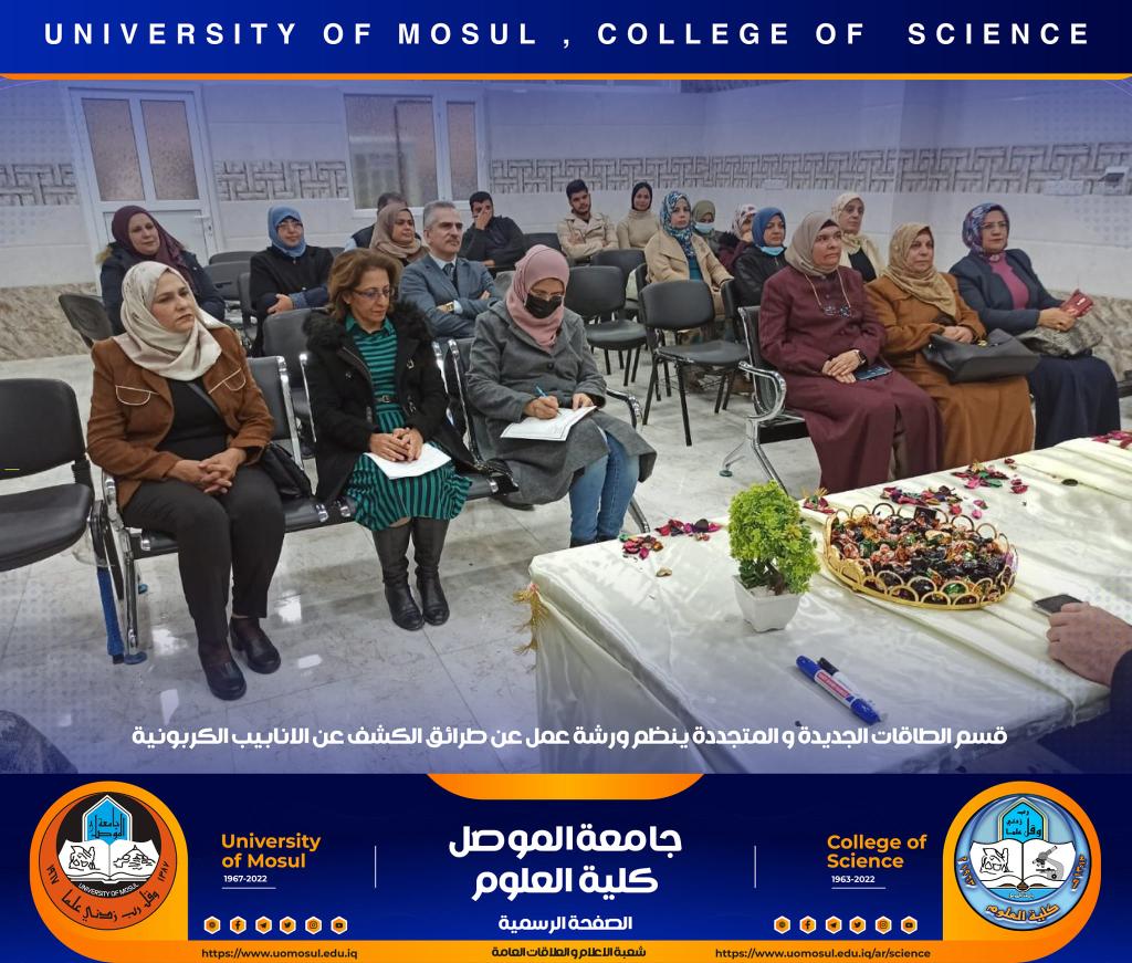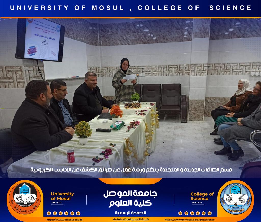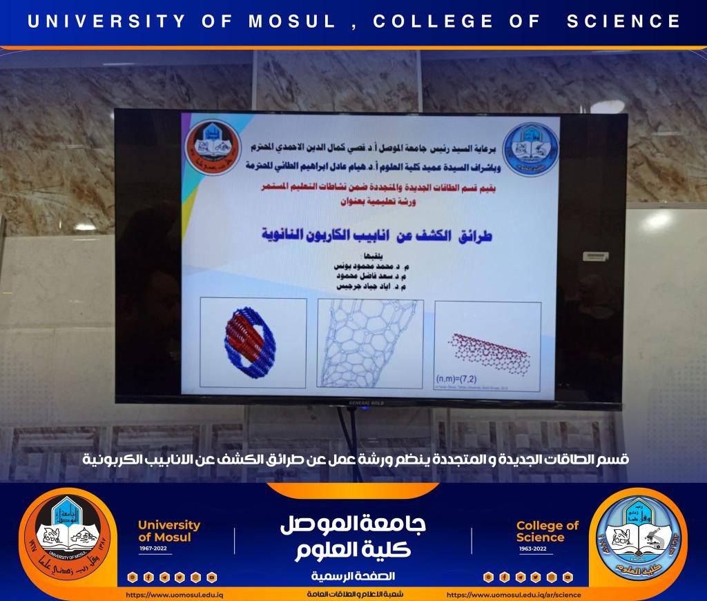 برعاية السيد رئيس جامعة الموصل الأستاذ الدكتور قصي كمال الدين الأحمدي وبإشراف السيدة عميد كلية العلوم الأستاذ الدكتورة هيام عادل إبراهيم ، أقام قسم الطاقات الجديدة والمتجددة في كليتنا ورشة عمل بعنوان ” طرائق الكشف عن انابيب الكاربون النانوية‟ وذلك صباح يوم الثلاثاء الموافق 13 كانون الأول 2022 على القاعة الالكترونية للقسم حضرها جمع من التدريسيين والطلبة.القى محاضرات الورشة كل من المدرس الدكتور محمد محمود يونس والمدرس الدكتور سعد فاضل محمود والمدرس الدكتور أياد جياد جرجيس ، و تضمنت التعريف بأنابيب الكاربون النانوية وتطبيقاتها وشرح الطرق التفصيلية المختلفة لكشف وتمييز أنواعها المتعددة.شعبة الإعلام والعلاقات العامةالأربعاء 14 كانون الأول 2022