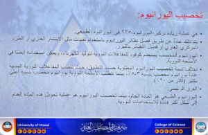 برعاية السيد رئيس جامعة الموصل الأستاذ الدكتور وحيد محمود الإبراهيمي المحترم، وبإشراف السيدة عميد كلية العلوم الأستاذ الدكتورة هيام عادل إبراهيم الطائي المحترمة، اقيمت يوم الأحد الموافق  29 حزيران 2025 ورشة عمل في قسم الفيزياء بكليتنا بعنوان ” كيفية التعامل مع الاشعاع النووي ” القاها الاستاذ الدكتور فراس محمد علي ، حضرها السيد المعاون الاداري الاستاذ المساعد الدكتور عمر عادل شريف وعددٌ من تدريسيي القسم وطلبة الدراسات العليا المحترمين .