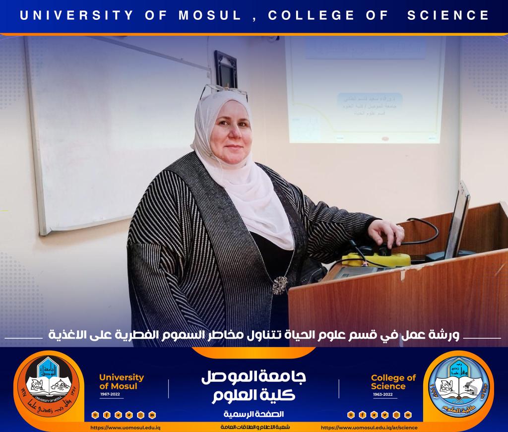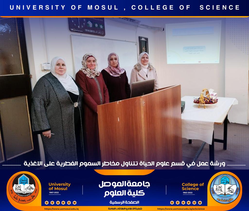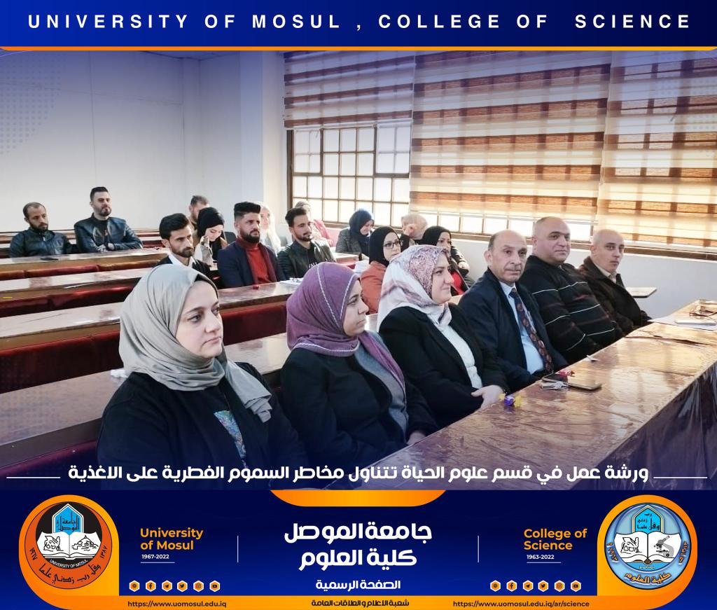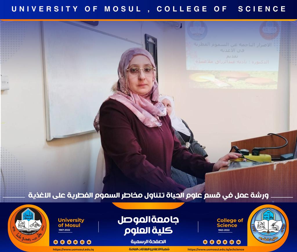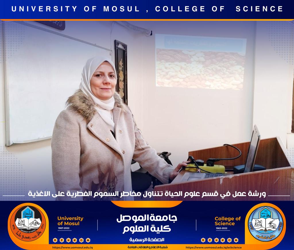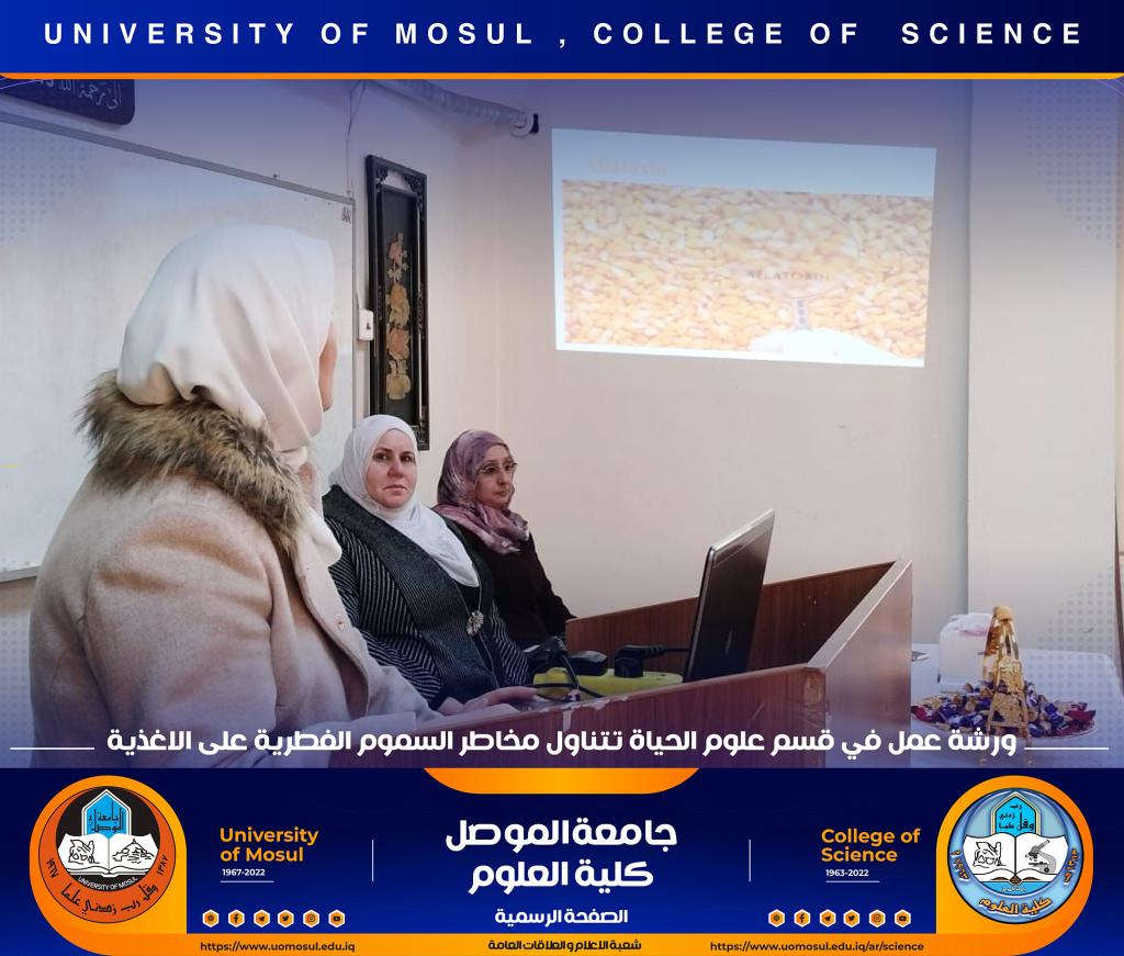 برعاية السيد رئيس جامعة الموصل الأستاذ الدكتور قصي كمال الدين الأحمدي وبإشراف السيدة عميد كلية العلوم الأستاذ الدكتورة هيام عادل إبراهيم ، أقام قسم علوم الحياة في كليتنا ورشة عمل بعنوان ” مخاطر السموم الفطرية على الأغذية ‟ صباح يوم الخميس الموافق 8 تشرين الثاني 2022 في رحاب قاعة الدكتورة هناء الصالح ، حضرها السيد رئيس القسم و عدد من تدريسي وطلبة القسم.تناولت الورشة عدة محاور :