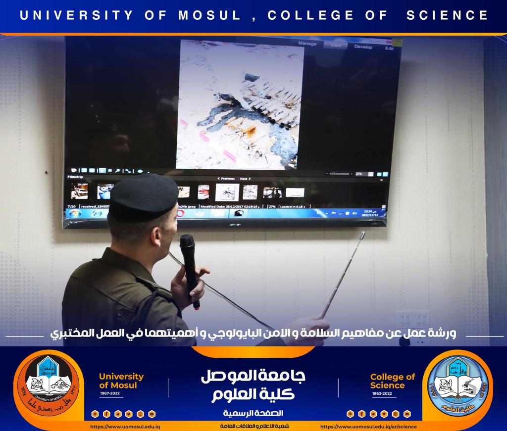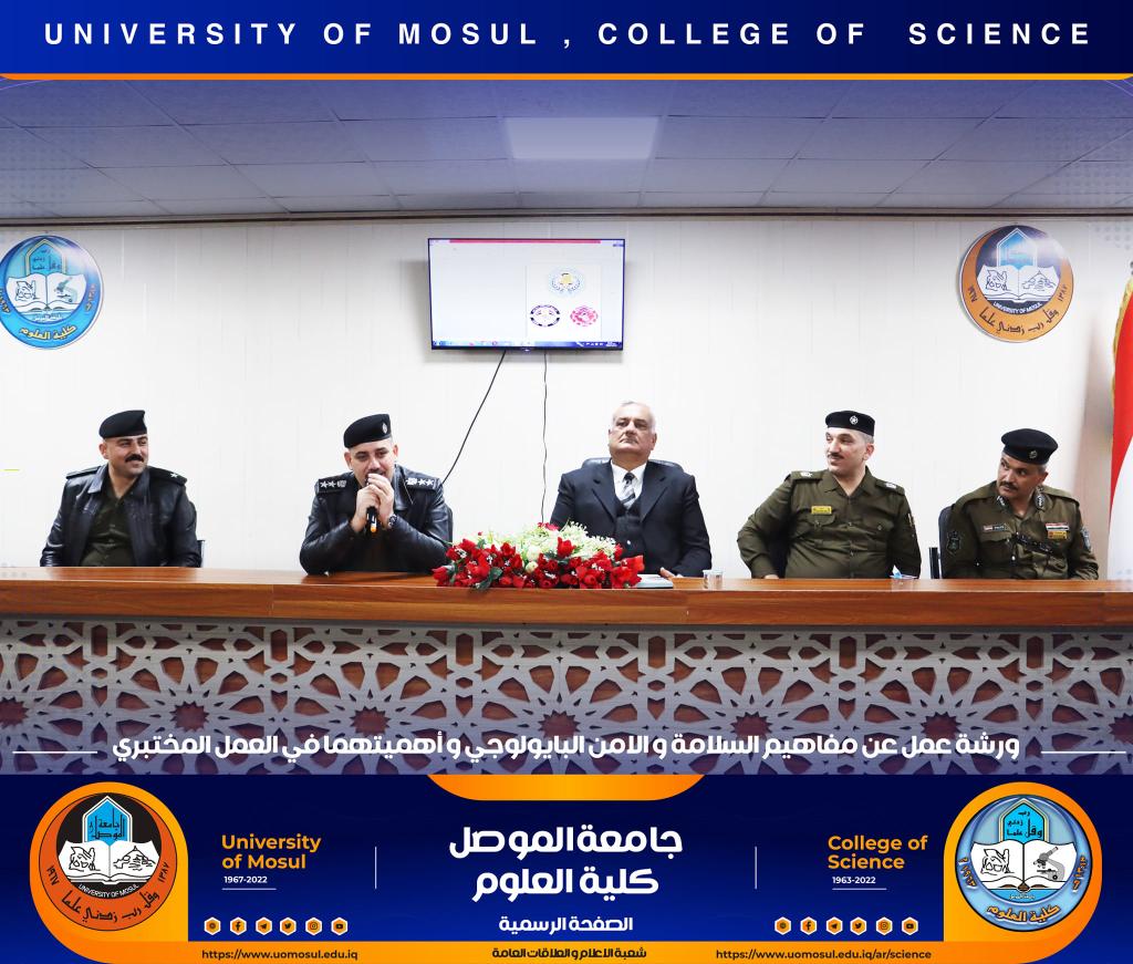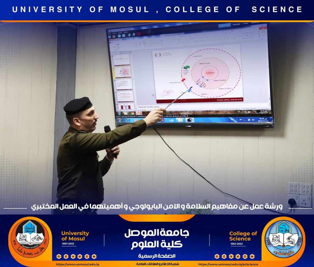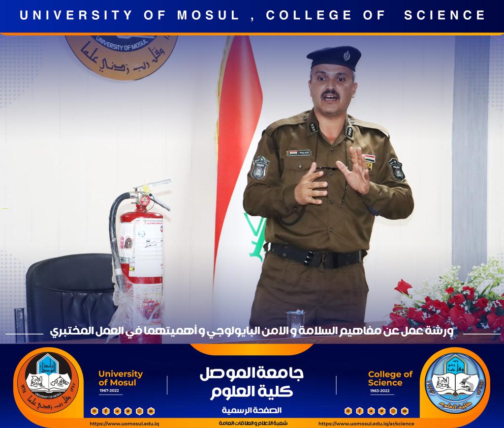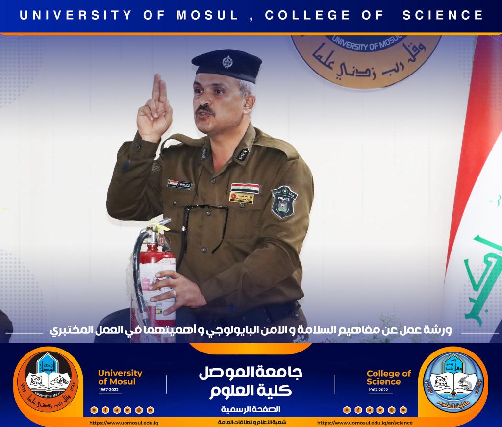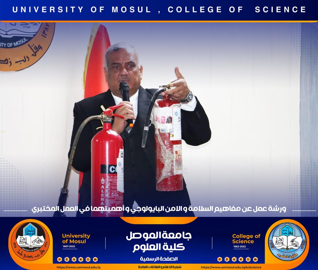 برعاية كريمة من لدن السيد رئيس جامعة الموصل الأستاذ الدكتور قصي كمال الدين الأحمدي وبإشراف و حضور السيدة عميد كلية العلوم الأستاذ الدكتورة هيام عادل إبراهيم وتأكيداً على دور الجامعة في التعاون مع مؤسسات و دوائر الدولة المختلفة ، أقامت الكلية و بالتعاون مع مديرية الدفاع المدني في مدينة الموصل و فريق CBRN التابع لرئاسة جامعة الموصل ورشة عمل بعنوان ” مفاهيم السلامة والأمن البايولوجي و أهميتهما في العمل المختبري” صباح يوم الإثنين الموافق 12 كانون الأول 2022 في رحاب قسم علوم الحياة.حضر الورشة السادة أعضاء مجلس الكلية وجمع غفير من تدريسي و طلبة الكلية.القى محاضرات الورشة السيد سفيان إدريس محمد مسؤول شعبة الدفاع المدني في جامعة الموصل و العقيد الفيزياوي سعد حمادي حسين مدير الإعلام في مديرية الدفاع المدني في نينوى ، والرائد محمد سعدي جاسم مسؤول شعبة ال CBRN فيها ، والملازم عباس حسن قاسم ( أحد خريجي قسم الكيمياء في كليتنا ) ضابط شعبة الوقاية والسلامة الصناعية في المديرية.هدفت الورشة الى التعريف بأهم مفاهيم السلامة المهنية في الأماكن العامة و المختبرات العلمية و المنازل و كيفية التعامل مع المواد الكيميائية إضافة الى آلية معالجة الأخطار الناجمة عنها .كما تطرقت الى أبرز التفاعلات الناجمة عن تلك المخاطر و سبل الحيلولة دون حدوثها ، تناولت الورشة أيضاً أنواع الحروق و المطافئ المناسبة لكل نوع و آلية استخدام هذه المطافئ ، و ضرورة التوعية المستمرة للمجتمع و العاملين في المؤسسات الحكومية بمثل هذه المخاطر و آلية ادارتها و الوقاية منها ، مع التعريف والتذكير برقم الطوارئ للدفاع المدني (115) .اختتمت بالورشة بمناقشة مستفيضة مع السادة التدريسين و الطلبة الحضور تضمنت الاجابة عن أبرز تساؤلاتهم.جدير بالذكر أن هذه الورشة تأتي مقدمة لممارسة عملية ستجري يوم غدٍ الثلاثاء الموافق 13 كانون الأول 2022 في مختبرات قسم الكيمياء تهدف الى ترسيخ تلك المفاهيم في أذهان الجميع.شعبة الإعلام والعلاقات العامةالاثنين 12 كانون الأول 2022