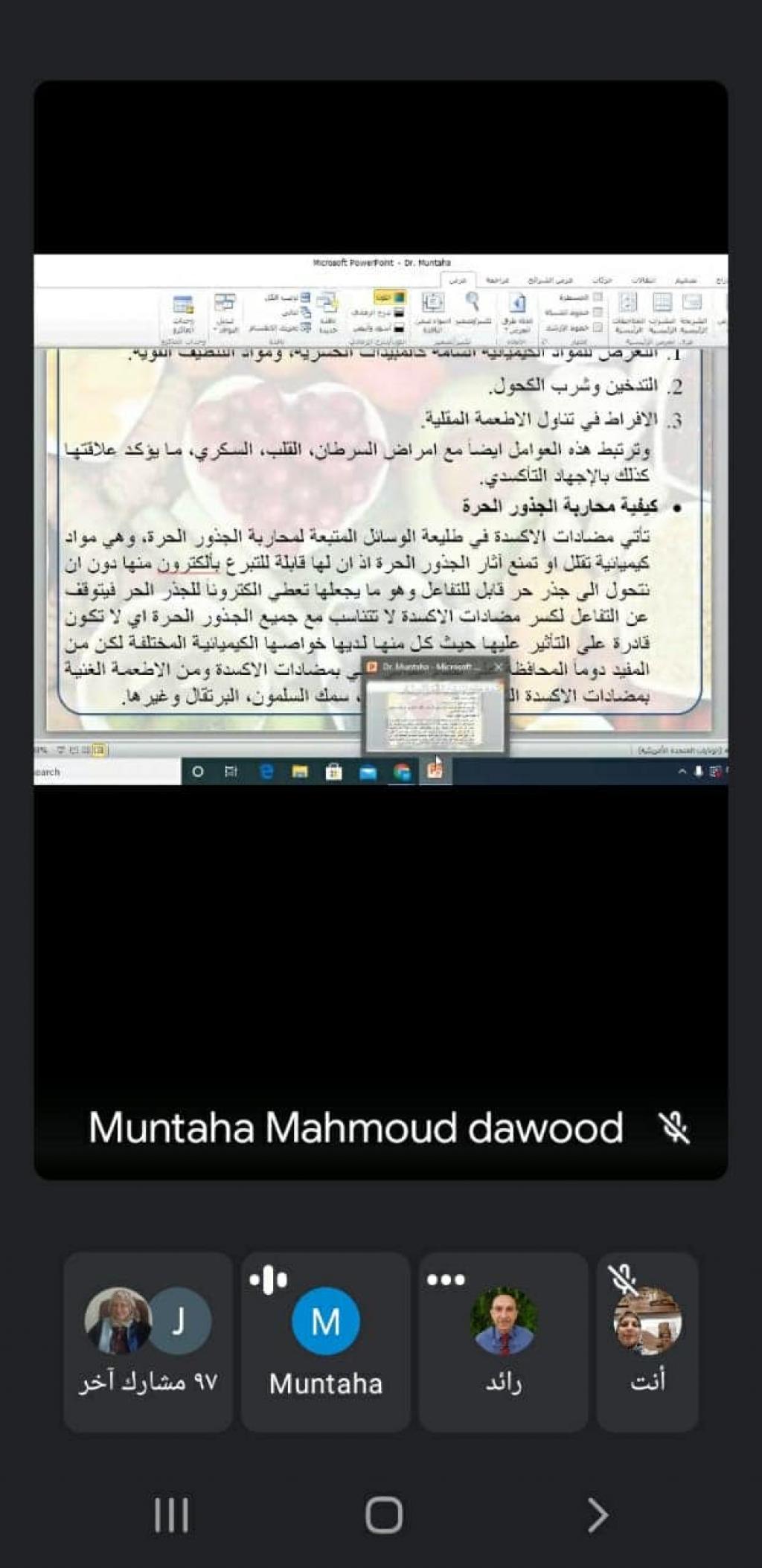 اقيمت في قسم علوم الحياة ورشة عمل بعنوان (التطبيقات الجزيئية والفسلجية للاجهاد التاكسدي) ٠نضمها كلا من :ا. م. د. سراب داوؤد سليمان، ا. م. د. منتهى محمد القطان ، م. عبير علي كاظم و م. م. رنى وعدالله يونس وباشراف رئيس قسم علوم الحياة الاستاذ المساعد الدكتور رائد سالم الصفار وذلك في تمام الساعه الثامنة من مساء يوم الأربعاء المصادف ٢٧/١/٢.٢١. تناولت الورشة موضوع الإجهاد التاكسدي وعلاقته بالامراض حيث أن هناك العديد من الامراض الناجمة عن الجذور الحرة منها أمراض الجهاز العصبي وأمراض القلب والاوعية الدموية بالإضافة إلى الشيب وفقدان المرونه للجلد وتساقط الشعر ومرض السكري والسرطان، حضرها مجموعه مختلفة من تدريسي جامعة الموصل بالإضافة إلى جامعات أخرى وطلبة الدراسات العليا.