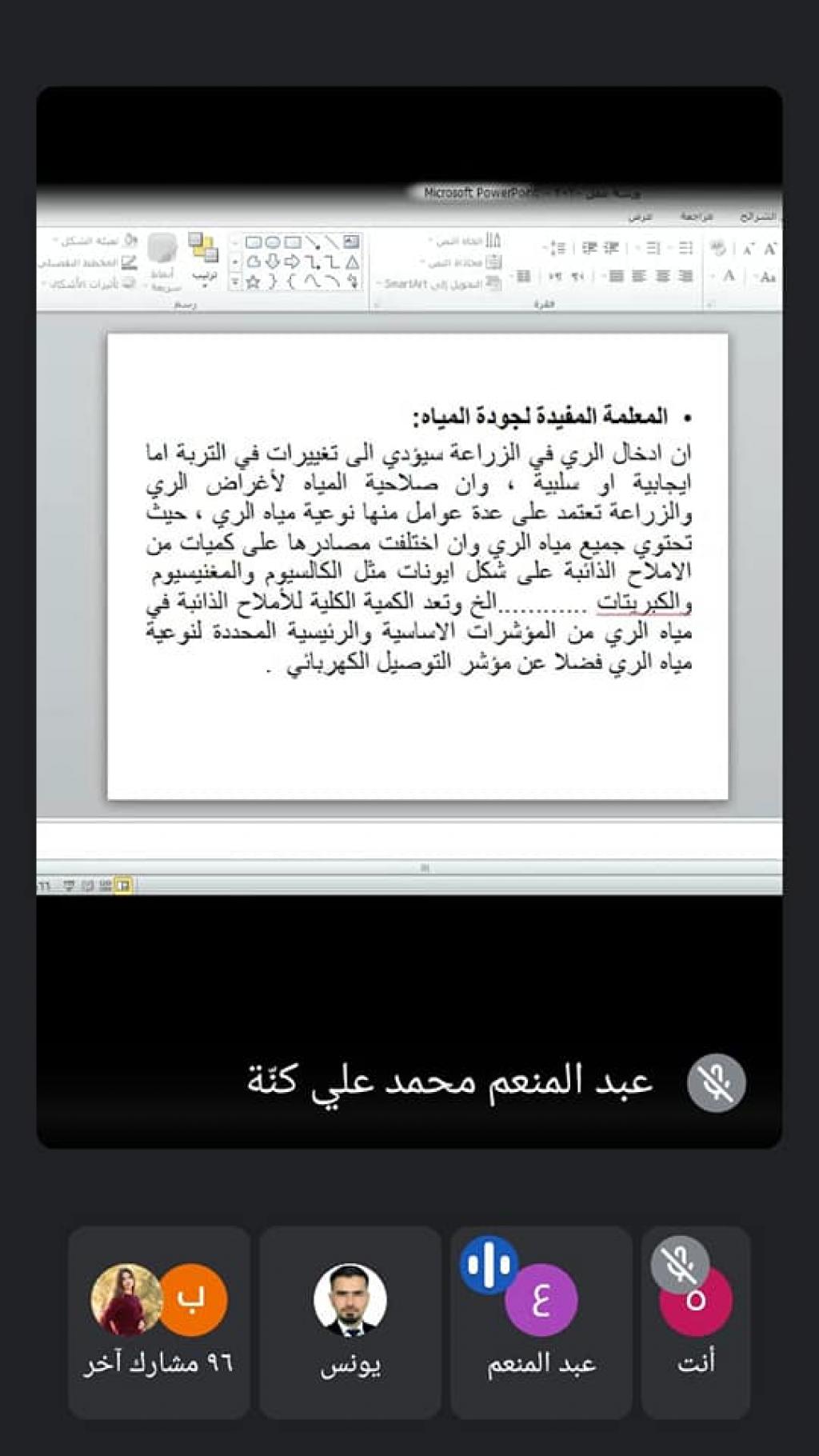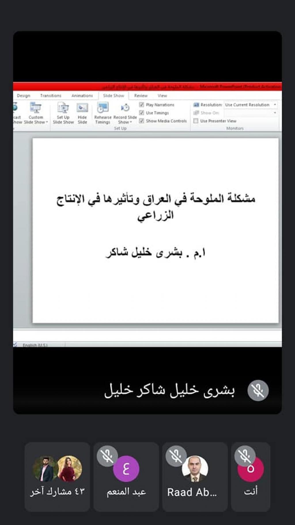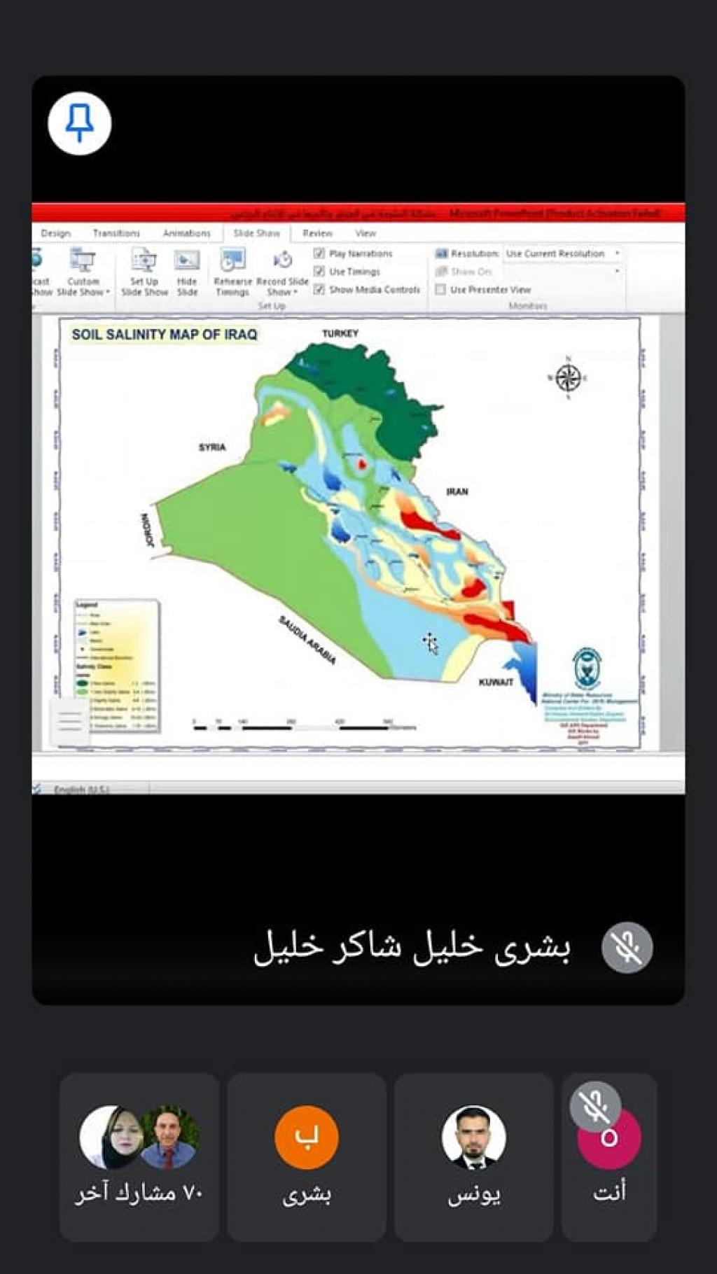 برعاية السيدة عميد كلية العلوم الاستاذ المساعد الدكتورة هيام عادل الطائي وبحضور السيد رئيس قسم علوم الحياة الاستاذ المساعد الدكتور رائد سالم الصفار، اقيمت في قسم علوم الحياة ورشة عمل بعنوان (مشكلة الملوحة وأثرها في الإنتاج الزراعي في العراق) في تمام الساعة الثامنة من مساء يوم الثلاثاء المصادف 16 آذار 2021 ، حيث كانت السيدة ا. م. بشرى خليل شاكر المتحدث الاول في الورشة وتطرقت إلى مشكلة الملوحة وأثرها في الإنتاج الزراعي في العراق ، بعدها تحدث م. د. عبدالمنعم محمد علي كنه عن المعلمة المفيدة لجودة المياه. حضرها مجموعة مختلفة من الاساتذة من داخل وخارج العراق منها :جامعة القاهرة وجامعة دمنهور المصرية، جامعة كوفة و جامعة دهوك وجامعة بغداد وجامعة النهرين وجامعة السليمانية بالإضافة إلى وزارة التربية والكهرباء وطلبة الدراسات العليا والاولية.وقد منح كل مشترك شهادة مشاركة بورشة العمل.