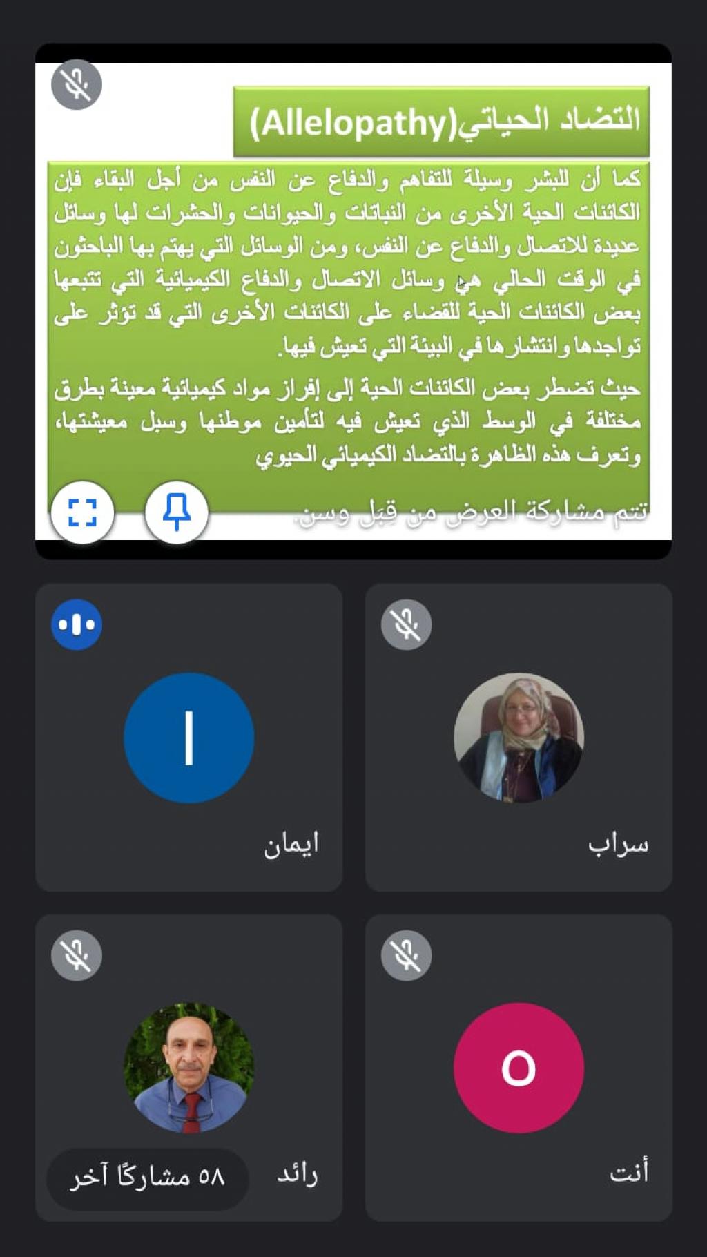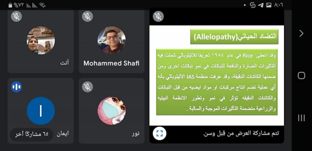 برعاية السيدة عميد كلية العلوم الأستاذ المساعد الدكتورة هيام عادل إبراهيم الطائي ، اقيمت في قسم علوم الحياة ورشة عمل الكترونية بعنوان ( الاليلوباثي دوره وتطبيقاته في النظام الزراعي ) وذلك في تمام الساعة الثامنة من مساء يوم الأربعاء الموافق 19 أيار 2021 و بحضور رئيس قسم علوم الحياة الأستاذ المساعد الدكتور رائد سالم الصفار ، القاها كلاً من الأستاذ الدكتورة جنان عبد الخالق والمدرس الدكتورة وسن صالح والأستاذ المساعد إيمان رضا الراوي .تناولت الورشة تعريف التضاد الحياتي وتأثيره السلبي والايجابي على النباتات المجاورة و الأحياء الدقيقة كما تطرقت إلى طرق انتقال المركبات الاليلوباثية ، الغسيل ، التطاير، افرازات الجذور و تحلل المتبقيات النباتية في التربة .كما تناولت أيضاً مصادر المركبات الاليوباثي وآلية التأثير بوجود العوامل الاحيائية وغير الاحيائية فضلاً عن تطبيقات ظاهرة الاليلوباثي في النظام الزراعي في مجالات عديده إضافة إلى عرض وافي لتطبيق الاليلوباثي في مجال المكافحة الحيوية للأدغال والحشرات والفطريات والاحياء المجهرية.وقد شهدت الورشة حضوراً مميزاً من مختلف التدريسين من داخل وخارج العراق منها جامعة حلوان ، سوهاج ، جامعة بغداد ، تكريت ، زاخو ، كركوك ، الجامعة التقنية الشمالية. حيث دار حوار علمي بين المحاضرين والسادة المشاركين .وتم منح شهادة مشاركة للمشاركين في الورشة .