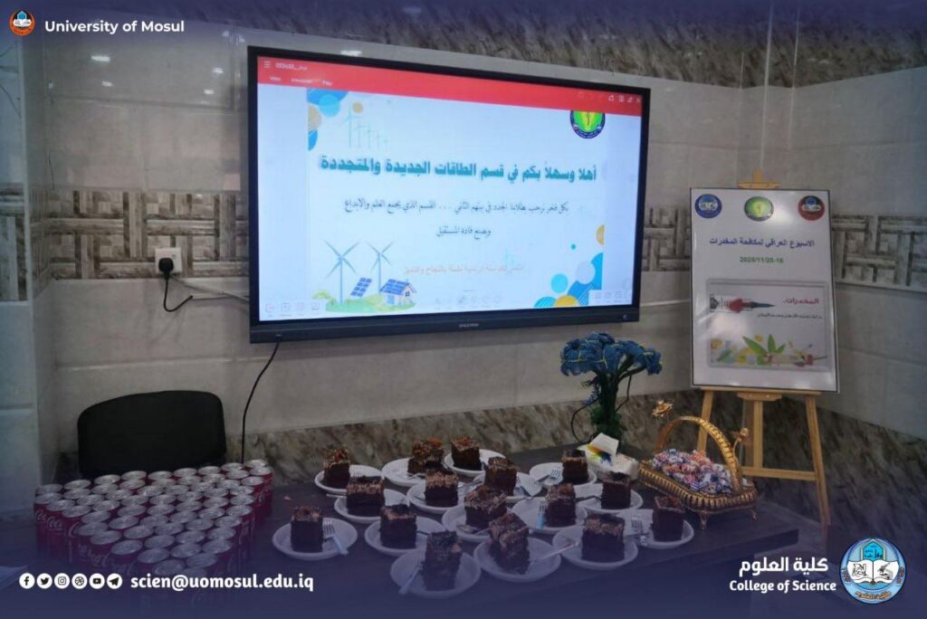 برعايةٍ مُباركةٍ من السيد رئيس جامعة الموصل الأستاذ الدكتور وحيد محمود الإبراهيمي المحترم، وبإشراف ومتابعة السيدة عميد كلية العلوم الأستاذ الدكتورة هيام عادل إبراهيم المحترمة وبالتعاون مع رئاسة جامعة الموصل / قسم الدراسات والتخطيط – وحدة التنمية المستدامة وبمتابعة السيد رئيس قسم الطاقات الجديدة والمتجددة الأستاذ المساعد الدكتور أحمد منير سهيل المحترم، أُقيمـت ورشة عمل علمية صباح يوم الاثنين الموافق 24 تشرين الثَّانـي 2025 في قاعة ابن سينا في القسـم.