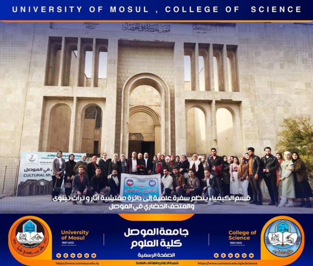 admin_omar2022-12-17T00:00:00+03:00تنفيذاً لتوجيهات السيدة عميد كلية العلوم الأستاذ الدكتورة هيام عادل إبراهيم ، نظّم قسم الكيمياء زيارة علمية لطلبة المرحلة الرابعة الى دائرة مفتشية آثار وتراث نينوى والمتحف الحضاري في الموصل صباح يوم الخميس الموافق 15 كانون الأول 2022، رافقهم خلالها عدد من أساتذة القسم .استقبل الوفد الزائر من قبل مدير الدائرة و عدد من موظفيه الذين قدموا شرحاً وافياً عن آلية معالجة الآثار كيميائياً وكذلك الاطلاع على طبيعة مختبرات هذه الدائرة .بدوره عبّر الوفد عن شكره و تقديره لحفاوة و حسن الاستقبال و التعاون المثمر البنّاء.شعبة الإعلام والعلاقات العامةالسبت 17 كانون الأول 2022