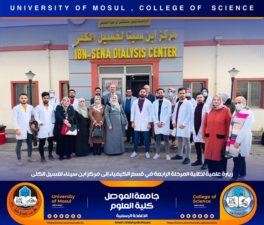 admin_omar2022-12-14T00:00:00+03:00تنفيذاً لتوجيهات السيدة عميد كلية العلوم الأستاذ الدكتورة هيام عادل إبراهيم ، نظّم قسم الكيمياء زيارة علمية لطلبة المرحلة الرابعة الى مركز ابن سينا لغسيل الكلى صباح يوم الأربعاء الموافق 14كانون الأول 2022رافقهم خلالها عدد من أساتذة القسم.استقبل الوفد الزائر من قبل مدير المركز وعدد من الأطباء والمهندس المسؤول عن الأجهزة الذي أعطى فكرة واضحة عن استخدام جهاز الغسيل والتعرف على مبدأ عملية الديلزة وكيفية تنفيذها والتي يتم من خلالها التخلص من الأملاح والمعادن الموجودة في الكليتين والتعرف على وحدة الغسيل ووحدة تنقية الماء وانتاج الماء الخالي من الأيونات وباقي وحدات المركز.شعبة الإعلام والعلاقات العامةالأربعاء 14 كانون الأول 2022