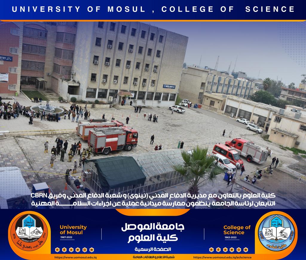 admin_omar2022-12-13T00:00:00+03:00برعاية السيد رئيس جامعة الموصل الأستاذ الدكتور قصي كمال الدين الأحمدي، و بحضور السيد المساعد العلمي الاستاذ الدكتور منير سالم طه و السيد المساعد الاداري الاستاذ الدكتور وحيد محمود الابراهيمي وبإشراف وحضور السيدة عميد كلية العلوم الاستاذ الدكتورة هيام عادل ابراهيم، و مدير الدفاع المدني العقيد رائد عبد الله اللطيف والسيد مسؤول CBRN في الجامعة الدكتور مهند يقظان إضافة إلى السيد سفيان ادريس محمد مسؤول شعبة الدفاع المدني في الجامعة.جرت في كليتنا ممارسة ميدانية عملية عن اجراءات السلامة المهنية في المختبرات قام بها فريق مديرية الدفاع المدني / نينوى و شعبة الدفاع المدني و فريق CBRN التابعان لرئاسة جامعة الموصل صباح [إقرأ المزيد]