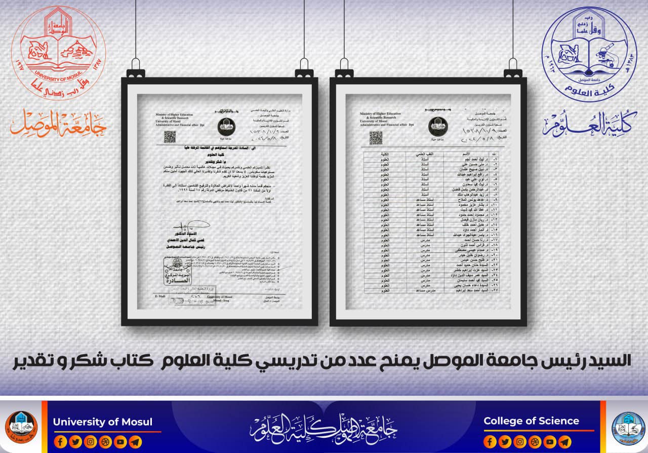 السيد رئيس جامعة الموصل يمنح كتاب شكر وتقدير لـِ(27) تدريسي وتدريسية من كليتنا