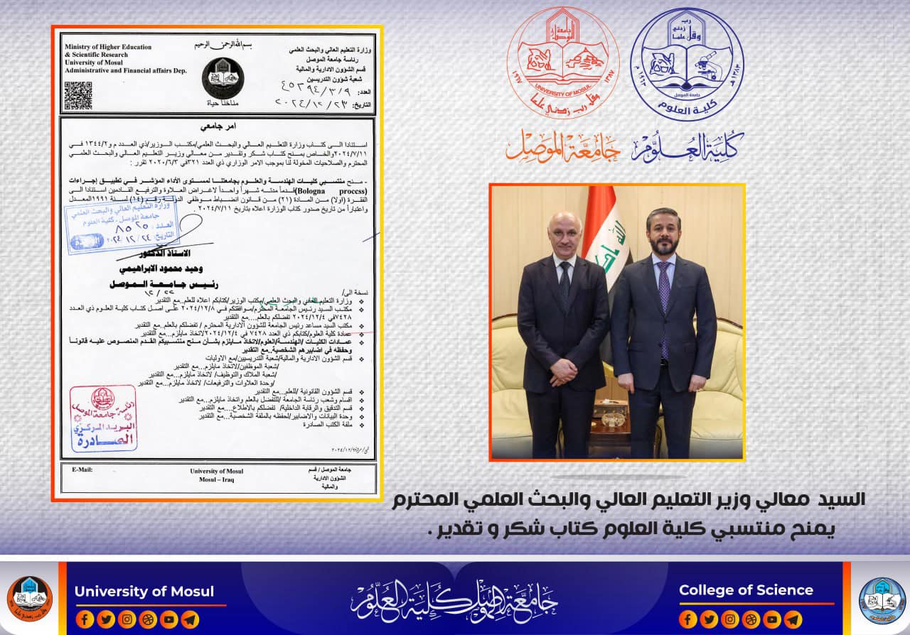 معالي وزيـر التعليـمِ العالـي والبحـثِ العلمـي يمنـحَ كتـابَ شكرٍ وتقديـر لمنتسبي كليتنا