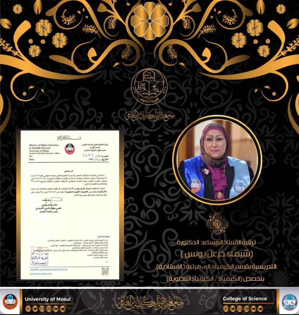 ناقش قسم الكيمياء في كلية العلوم بجامعة الموصل رسالة الماجستير الموسومة ” تحسين المواصفات الريولوجية للإسمنت باستخدام الياف البولي اثيلين النانوية ” يوم الاثنين الموافق 15 كانون الثاني 2024 حضر جانباً منها السيدة عميد الكلية الأستاذ الدكتورة هيام عادل ابراهيم الطائي والسادة معاوني العميد والسيد رئيس القسم وعدداً من تدريسي الكلية.