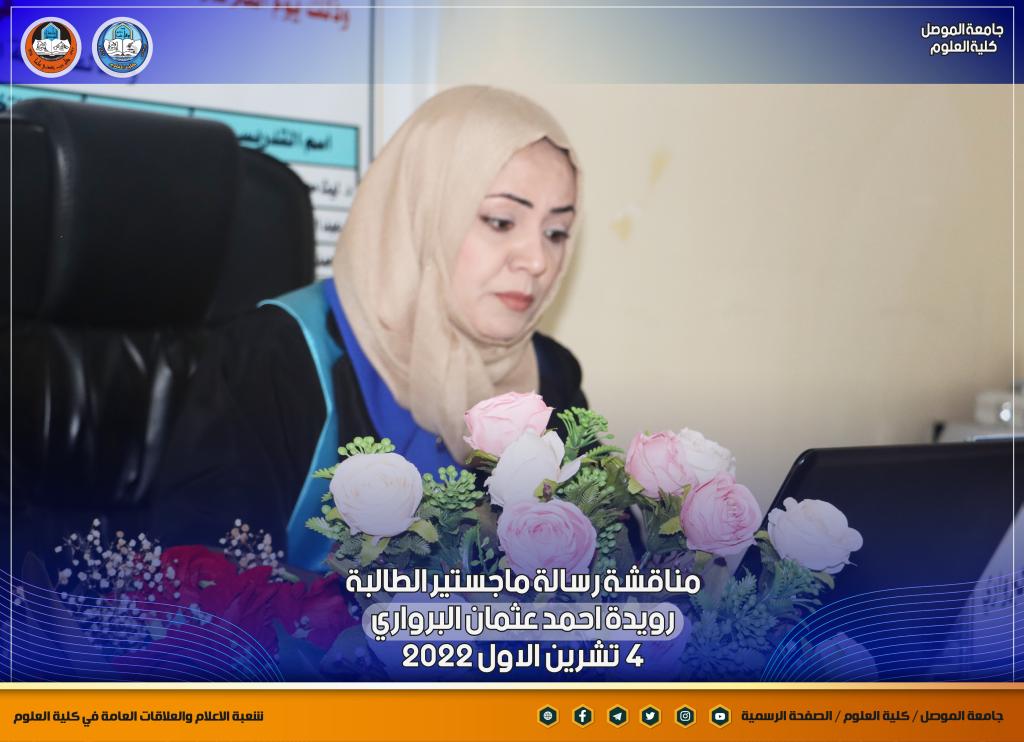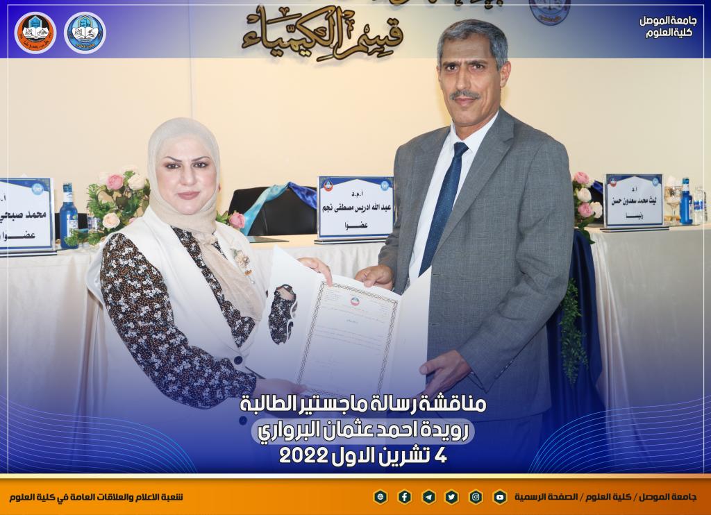 قدمت السيدة عميد كلية العلوم الاستاذ الدكتورة هيام عادل ابراهيم كتاب شكر وتقدير للدكتور احمد يونس عويد خلف لجهوده المبذولة في مناقشة الطالبة.