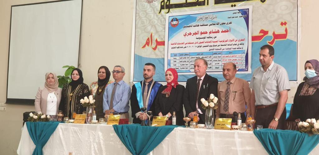 ناقشت كلية العلوم في جامعة الموصل يوم الخميس الموافق 15 تموز 2021 رسالة الماجستير الموسومة ” التحري عن الأنواع الجرثومية المسببة لإصابات العيون لدى مستخدمي العدسات اللاصقة ” ، حضرت السيدة عميد الكلية الأستاذ المساعد الدكتورة هيام عادل الطائي و السادة معاوني العميد جانباً منها.تناولت الدراسة التي تقدم بها الطالب ( أحمد هشام حمو ) من قسم علوم الحياة عزل وتشخيص الجراثيم المسببة لإصابات العيون لدى مستخدمي العدسات التجميلية وعدسات تصحيح البصر فضلاً عن استخدام جسيمات اوكسيد النحاس النانوية في طلاء العدسات للكشف عن إمكانية الحد من التلوث كما شملت الدراسة تقييم فعالية نوعين من محاليل حفظ العدسات الشائعة الاستخدام.هدفت الدراسة الى :أولاً: عزل وتشخيص الجراثيم المسببة لإصابات العيون والتحري عن قدرتها على تكوين الأغشية الحيوية .ثانياً: التحري عن الفعالية المضادة للجراثيم لجسيمات أوكسيد النحاس النانوية واستخدامها في طلاء العدسات لمنع تكوين الأغشية الحيوية .ثالثاً: اختبار الفعالية المضادة للجراثيم لسوائل حفظ العدسات وعدد من المستخلصات النباتية وقدرتها على ازالة الأغشية الحيوية .نتائج الدراسة :