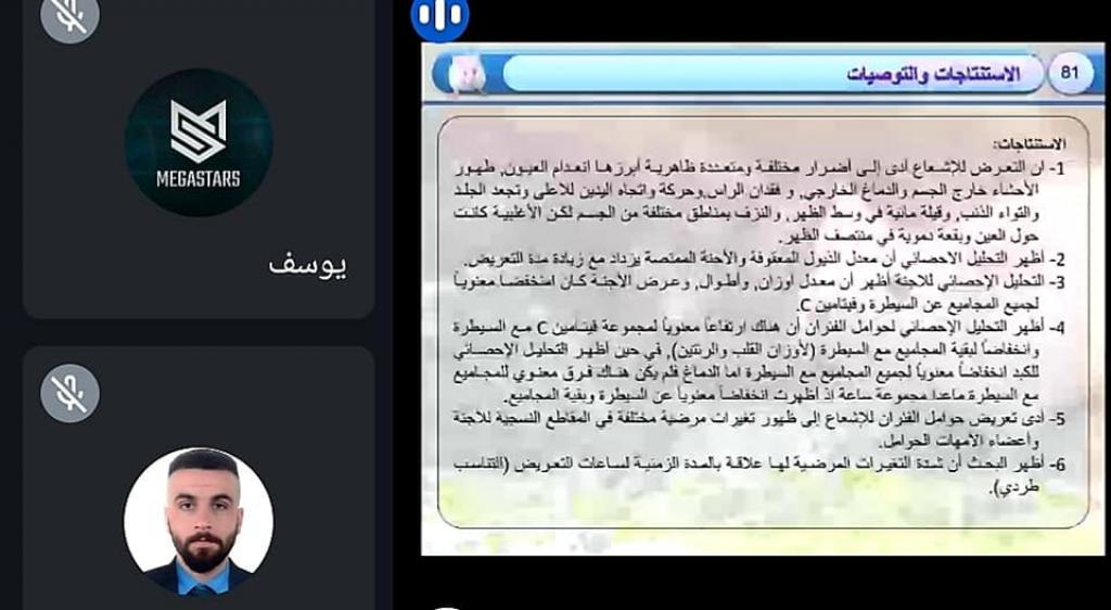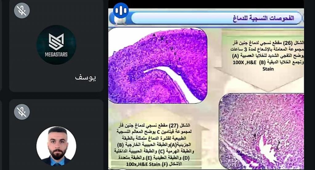 ضمن سلسلة النشاطات العلمية لقسم علوم الحياة وبحضور السيد رئيس قسم علوم الحياة الأستاذ المساعد الدكتور رائد سالم الصفار القت طالبة الماجستير ( مها خلف الجبوري ) حلقة دراسية عن رسالتها الموسومة ” تخفيف الكرب التأكسدي الناتج عن تأثير المجال الكهربائي على انسجة حوامل الفئران واجنتها بمضادات الأكسدة ” بإشراف أ.د. جنان حسيب .كما القت طالبة الماجستير ( هبة فارس أحمد شهاب ) حلقة دراسية عن رسالتها الموسومة ” دراسة بعض الخصائص الفيزيائية والكيميائية والاحيائية لنهر دجله ضمن مدينة الموصل-العراق ” بإشراف م. د. عبد المنعم محمد علي .وذلك في تمام الساعة التاسعة من مساء يوم الأربعاء الموافق 18 آب 2021مع تمنياتنا لطلبتنا الأعزاء دوام الموفقية والنجاح.