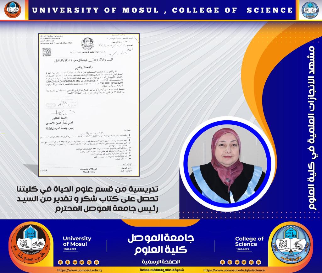 admin_omar2023-01-15T00:00:00+03:00منح السيد رئيس جامعة الموصل الأستاذ الدكتور قصي كمال الدين الأحمدي المحترم كتاب شكر و تقدير الى الأستاذ الدكتورة جنان عبد الخالق سعيد مع ما يترتب عليه من قدمٍ لمدة شهرٍ لأغراض العلاوة و الترفيع بالنظر لجهودها المبذولة في تسجيل ثلاث أصناف من الذرة الصفراء في بنك الجينات في المركز الوطني لمعلومات التكنلوجيا الحيوية NCBI، مع تقييم التأثير الاليلوباثي لعدد من الأدغال في نمو تلك الأصناف.تمنياتنا لمنتسبي كليتنا بالتوفيق و العطاء الدائم
