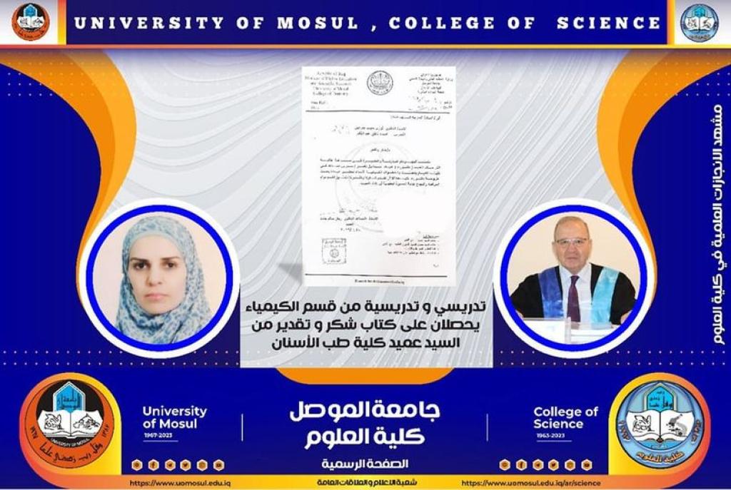 تدريسي و تدريسية من قسم الكيمياء في كليتنا يحصلان على كتاب شكر وتقدير من السيد عميد كلية طب الأسنان