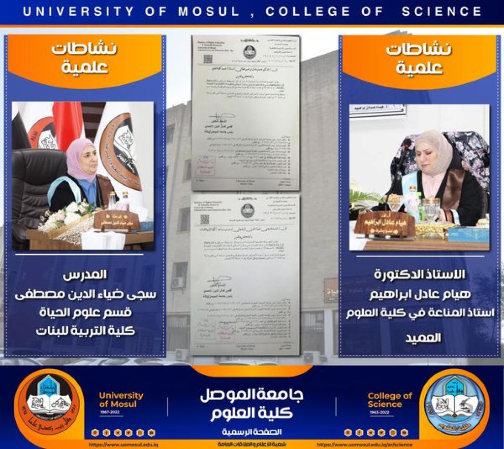 admin_omar2022-12-25T00:00:00+03:00منح السيد رئيس جامعة الموصل الأستاذ الدكتور قصي كمال الدين الأحمدي المحترم كتاب شكر وتقدير للسيدة عميد الكلية الأستاذ الدكتورة هيام عادل إبراهيم و طالبتها في دراسة الدكتوراه المدرس الدكتورة سجى ضياء الدين مصطفى التدريسية بكلية التربية للبنات كتاب شكر و تقدير مع ما يترتب عليه من قدمٍ لمدة شهرٍ لأغراض العلاوة و الترفيع بالنظر لجهودهما المبذولة في تسجيل عزلتين بكتيريتين تحت مسمى (SaHy-IQ-1, 2) في بنك الجينات في المركز الوطني لمعلومات التكنلوجيا الحيوية NCBI.الف مباركشعبة الإعلام والعلاقات العامةالأحد 25 كانون الأول 2022