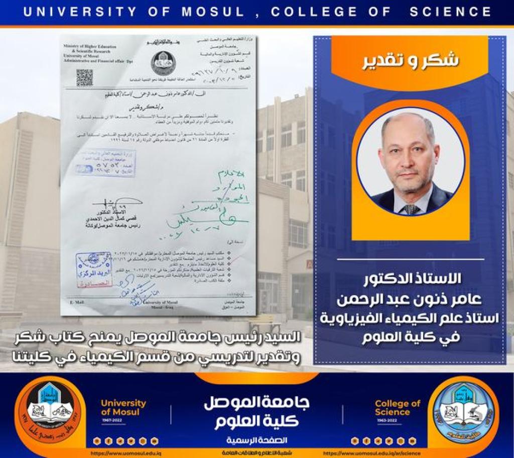 تدريسي من كليتنا يحصل على كتاب شكر وتقدير من السيد رئيس جامعة الموصل المحترم