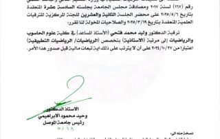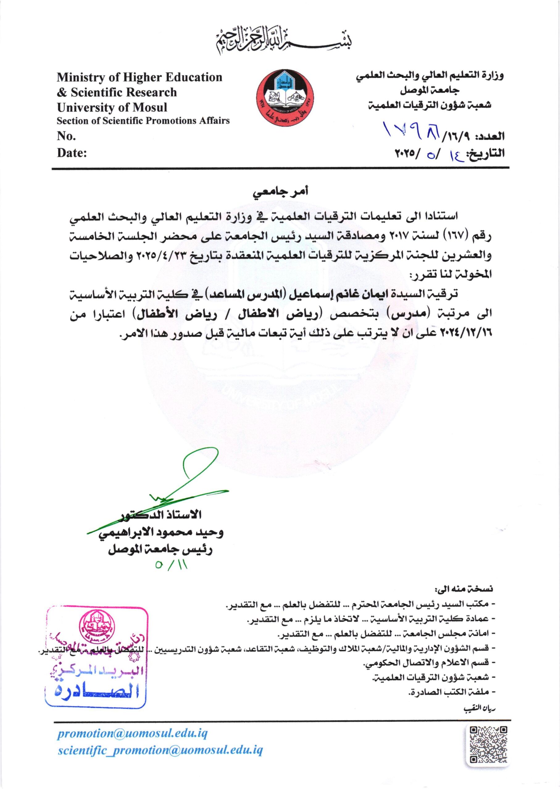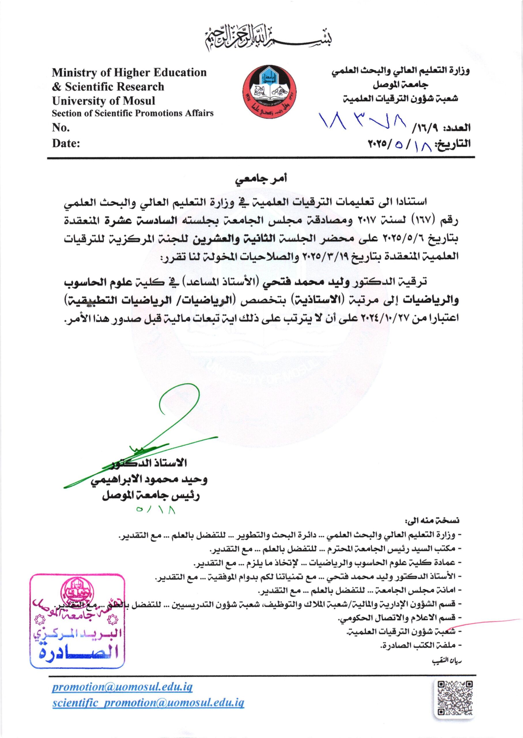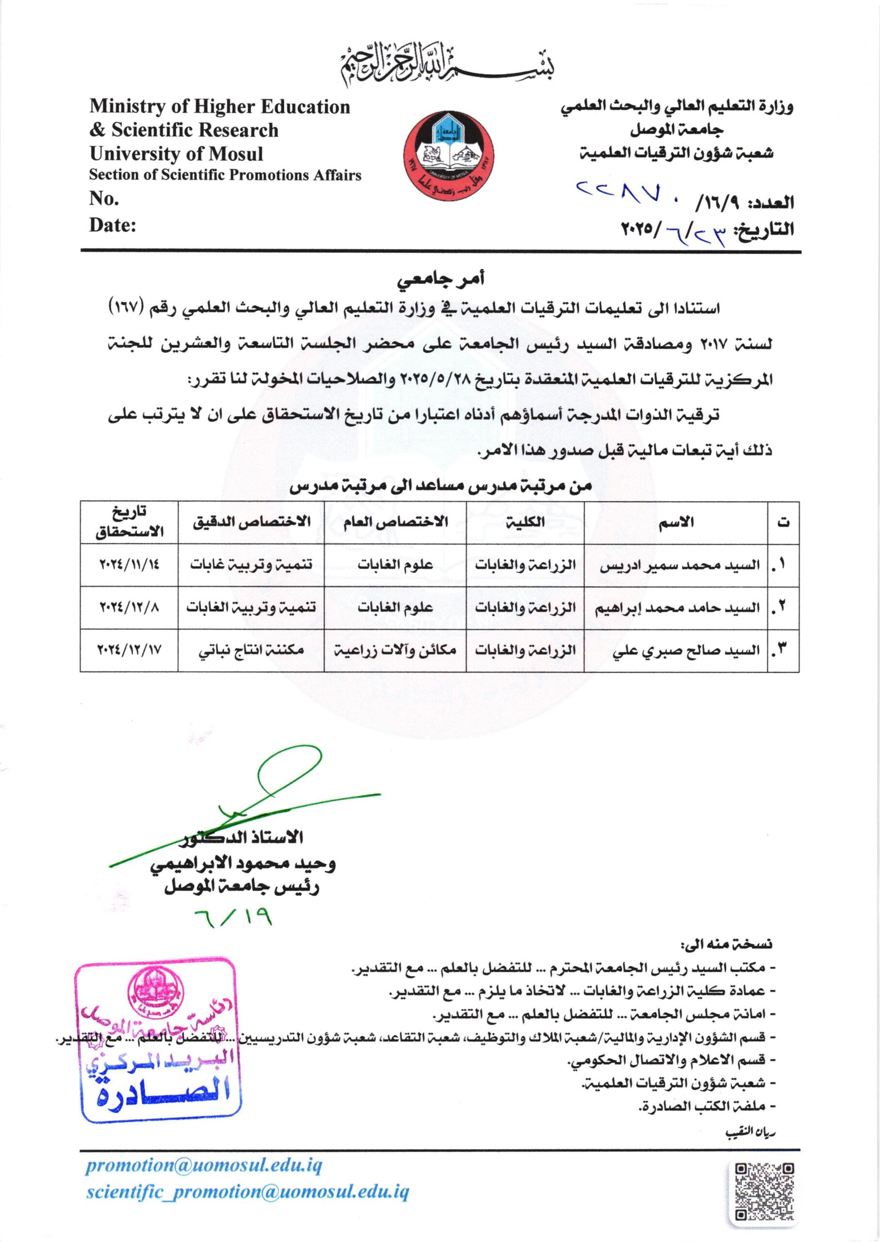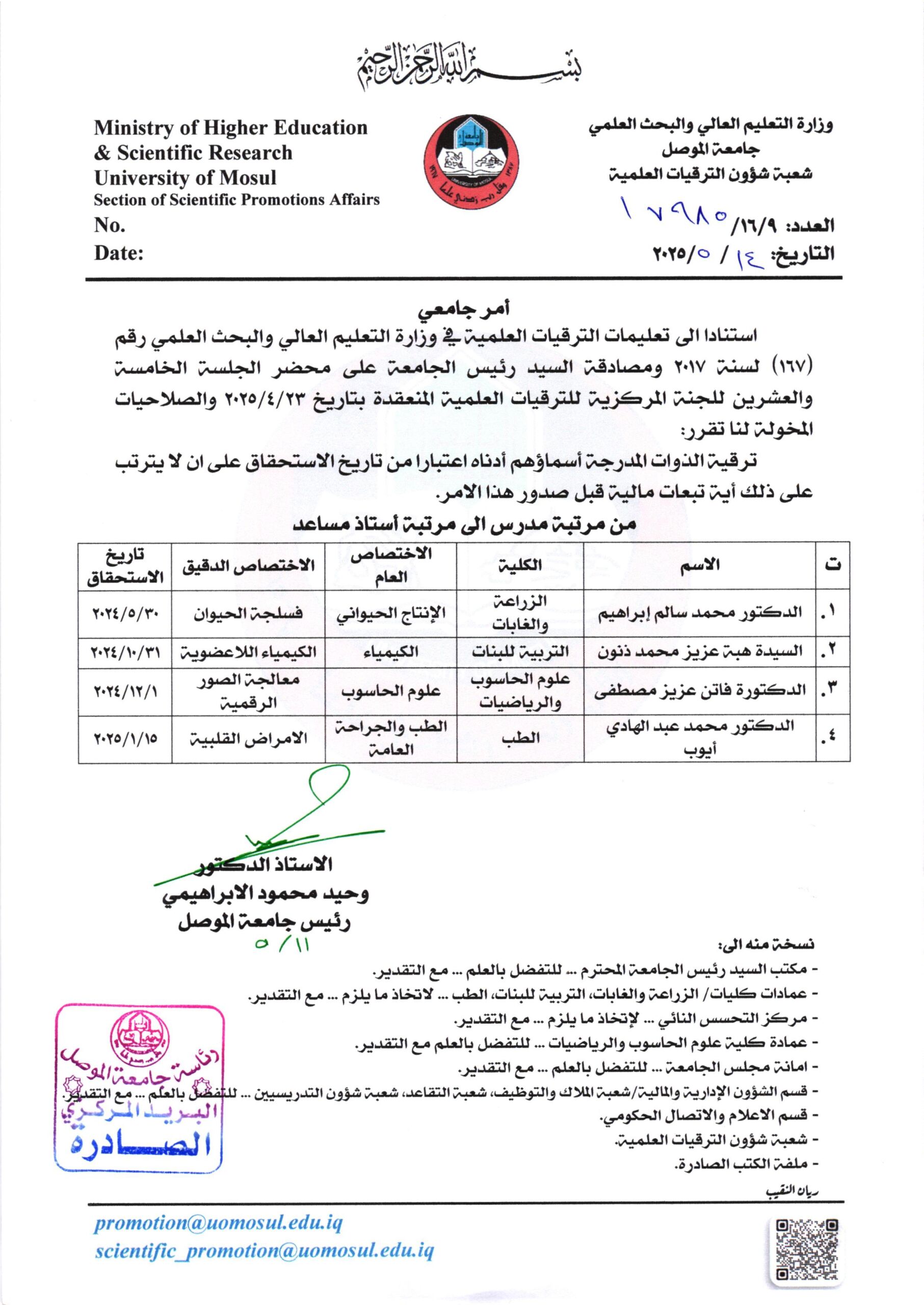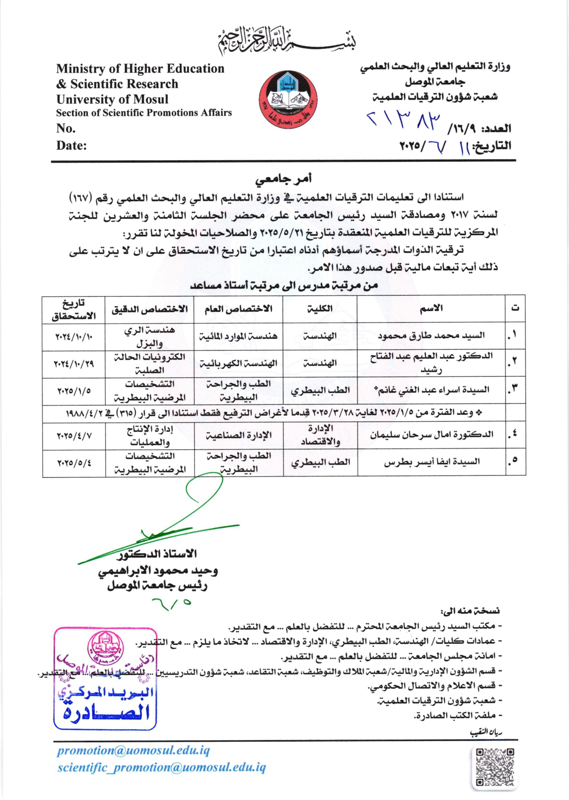 أمر جامعي لمرتبة أستاذ مساعد ج25 بتاريخ 2025/5/14