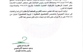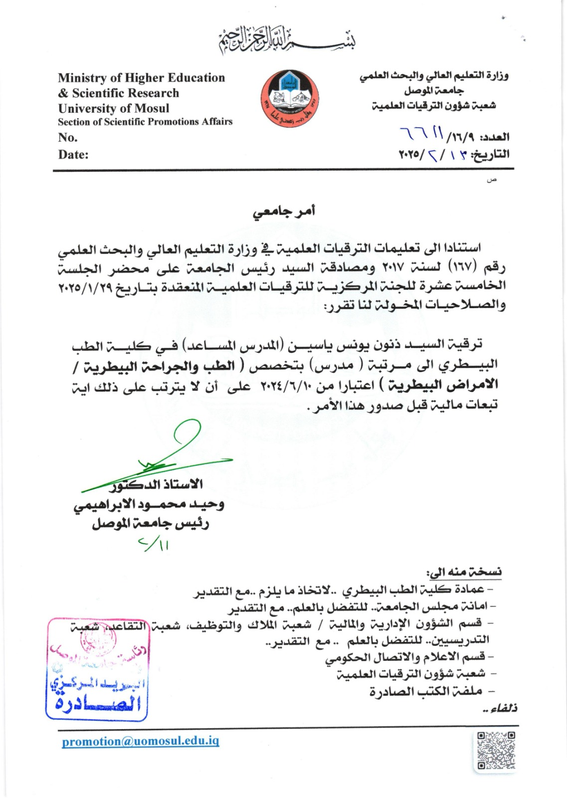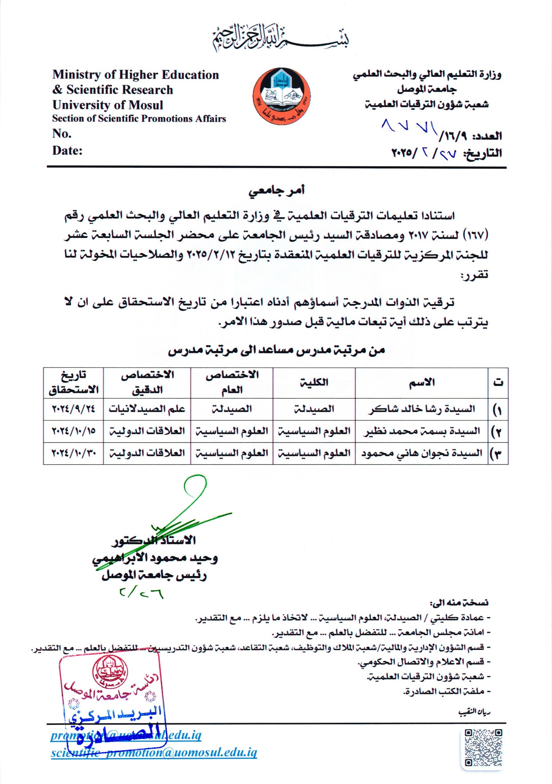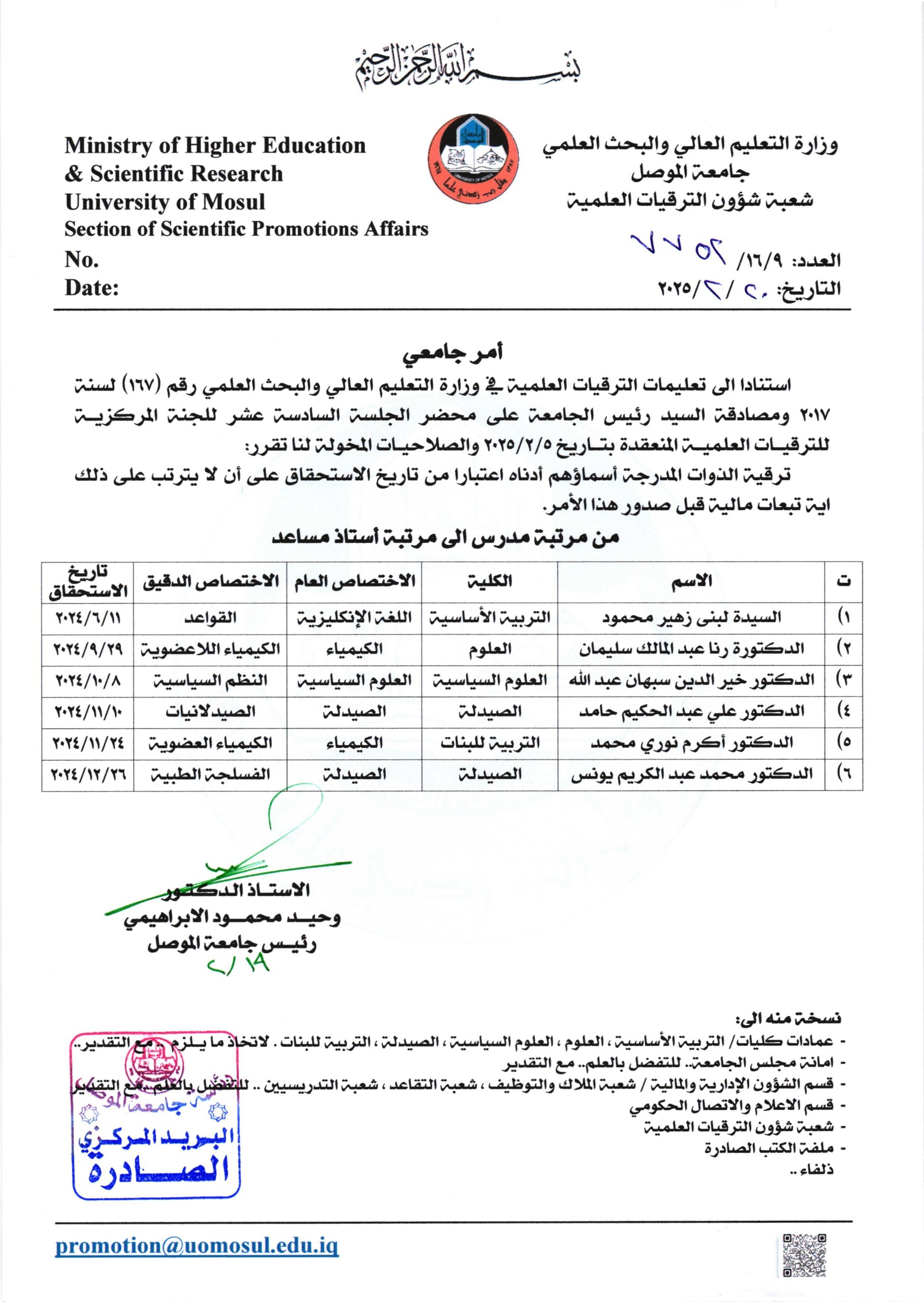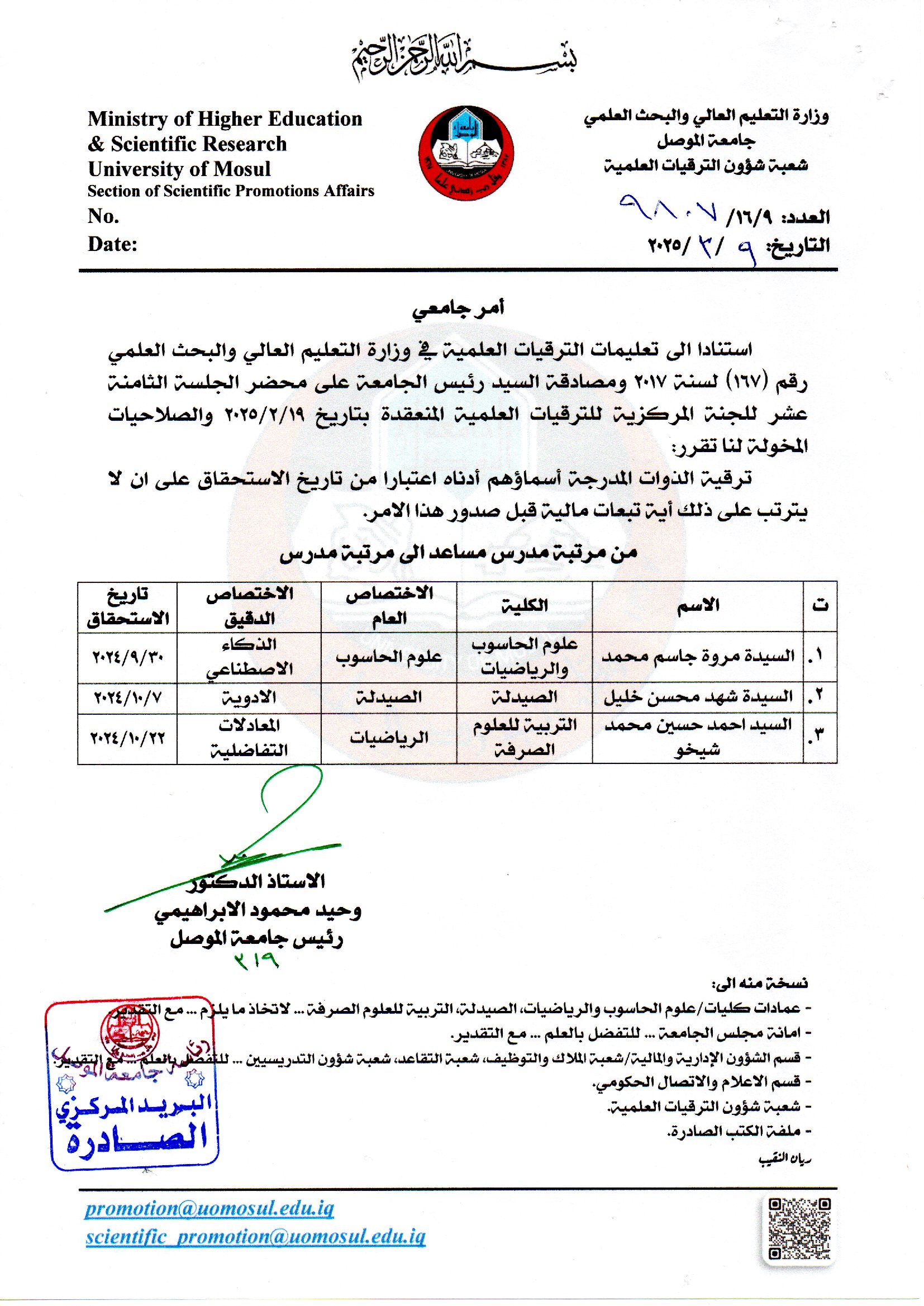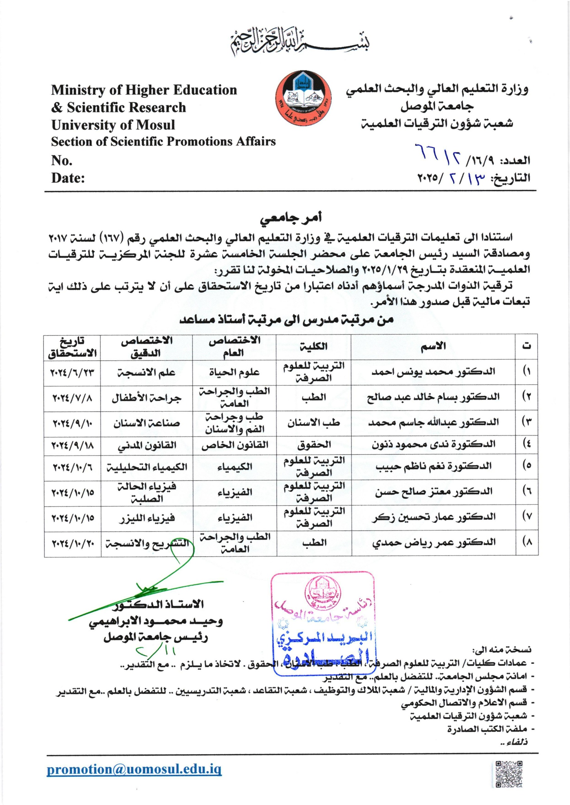 أمر جامعي لمرتبة أستاذ مساعد ج19 بتاريخ 2025/3/17