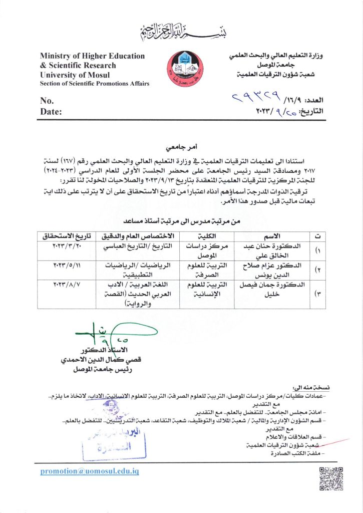 امر جامعي لمرتبة أستاذ مساعد ج1 بتاريخ 2023/9/25