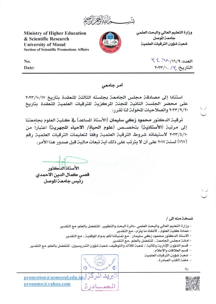 صدور الامر الجامعي لعدد من تدريسيي جامعتنا الى مرتبة مدرس