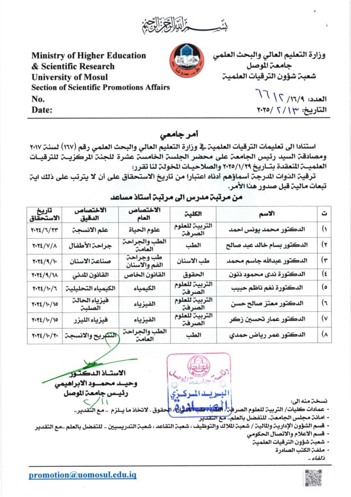 صدور الامر الجامعي لعدد من تدريسيي جامعتنا الى مرتبة أستاذ مساعد