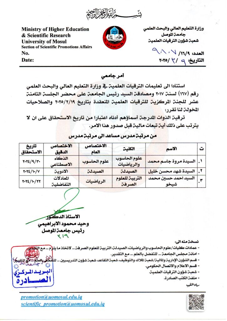 أمر جامعي لمرتبة مدرس ج18 بتاريخ 2025/3/9