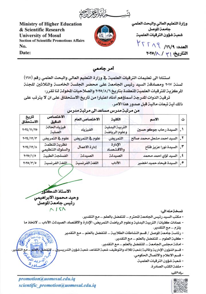أمر جامعي لمرتبة أستاذ مساعد ج35 بتاريخ 2025/8/31