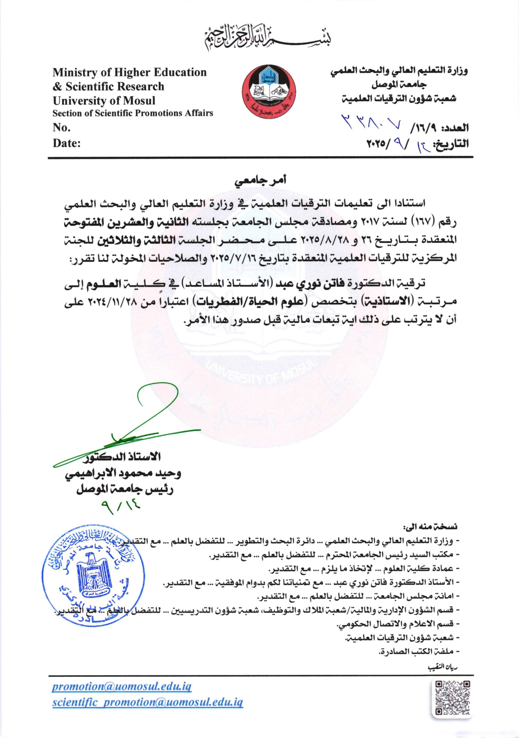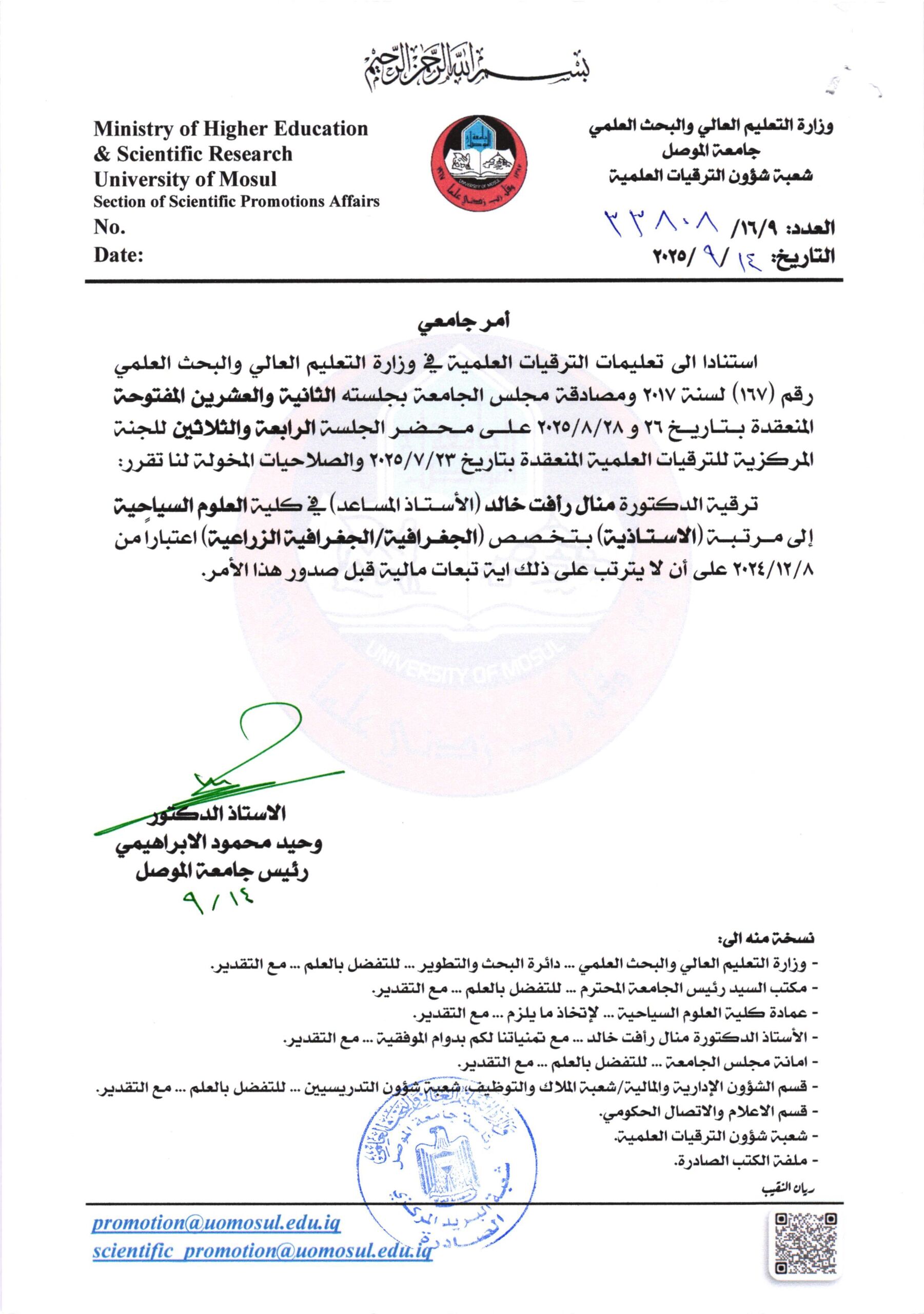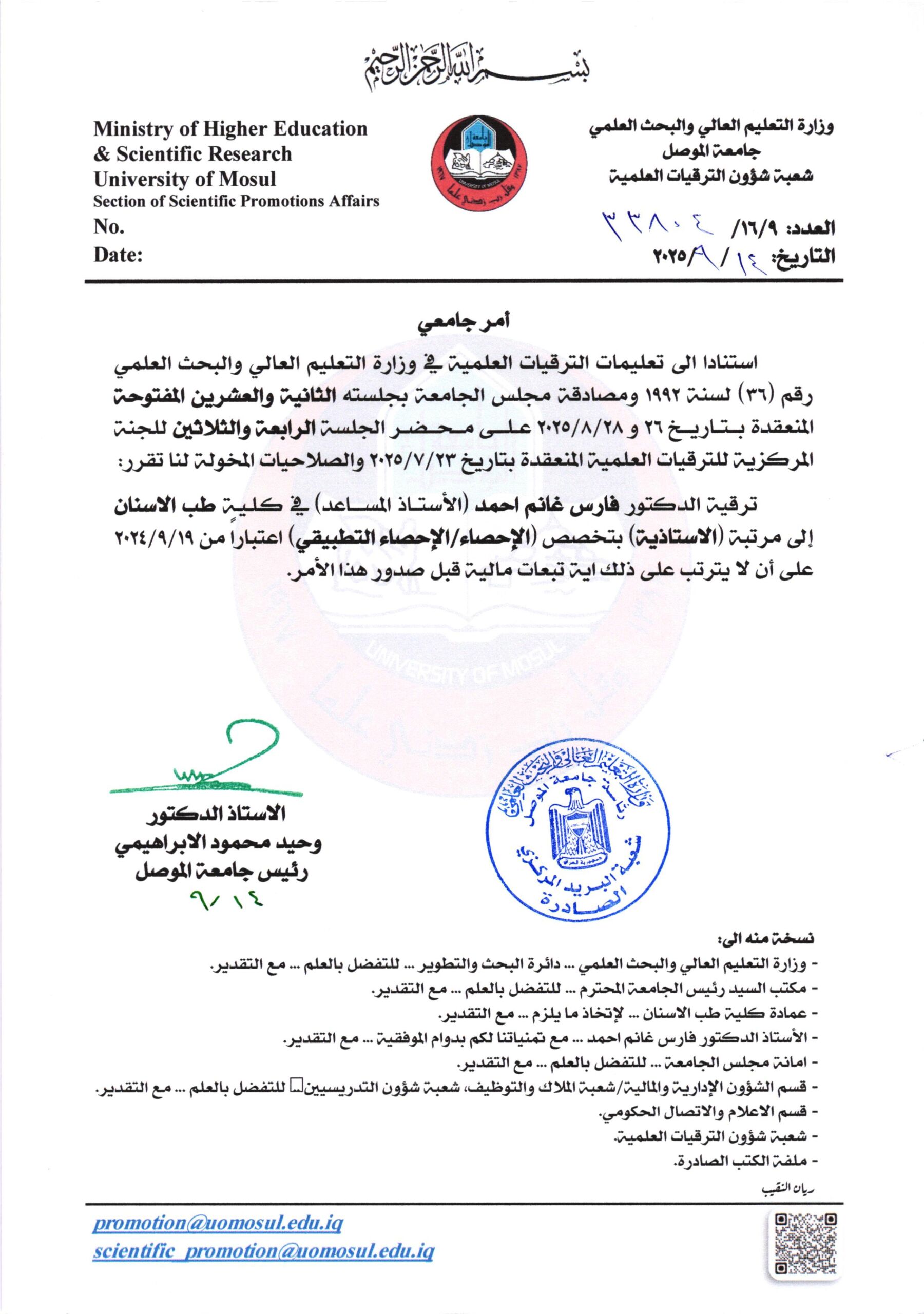 أمر جامعي لمرتبة الأستاذية ج33 و ج34 بتاريخ 2025/9/14