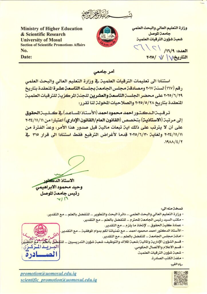 أمر جامعي لمرتبة الاستاذية ج29 بتاريخ 2025/7/17
