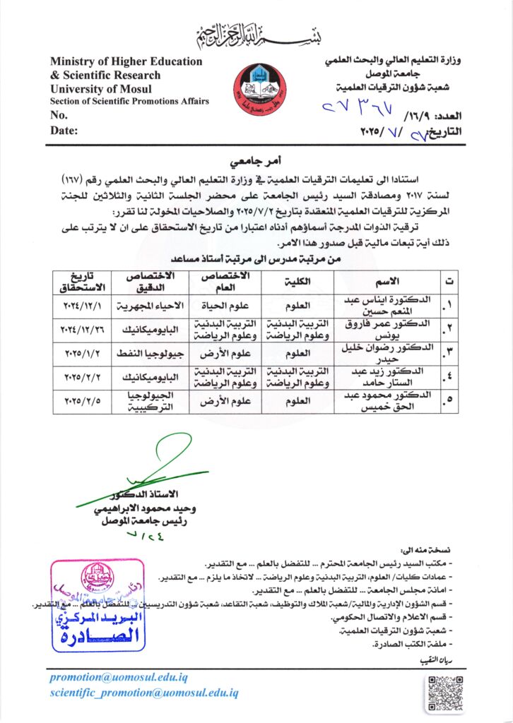 صدور الأمر الجامعي لعدد من تدريسيي جامعتنا الى مرتبة مدرس
