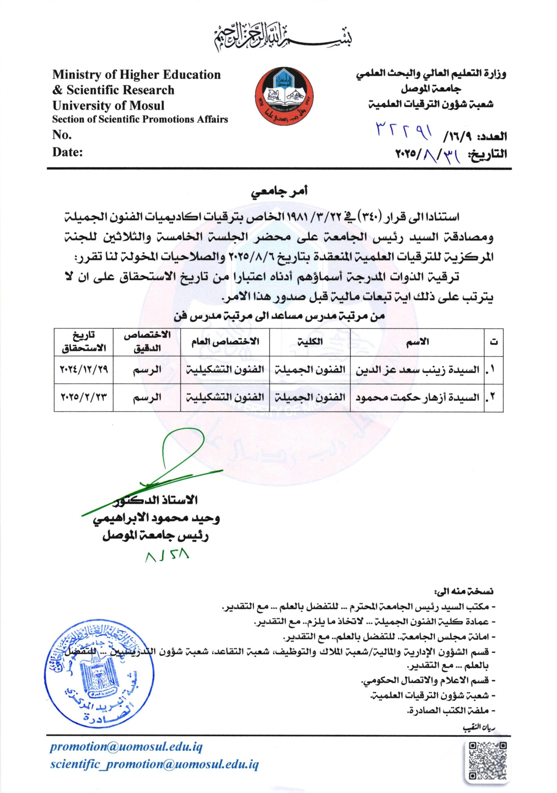 أمر جامعي لمرتبة مدرس ج35 بتاريخ 2025/8/31