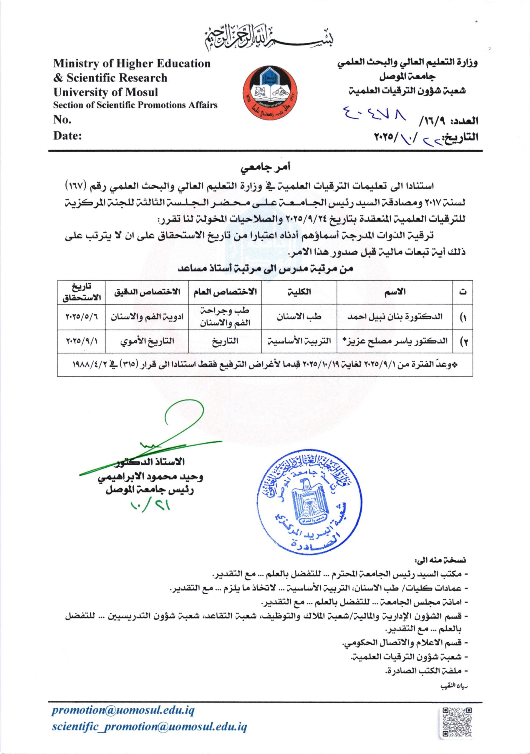 أمر جامعي لمرتبتي أستاذ مساعد و مدرس ج3 بتاريخ 2025/10/22