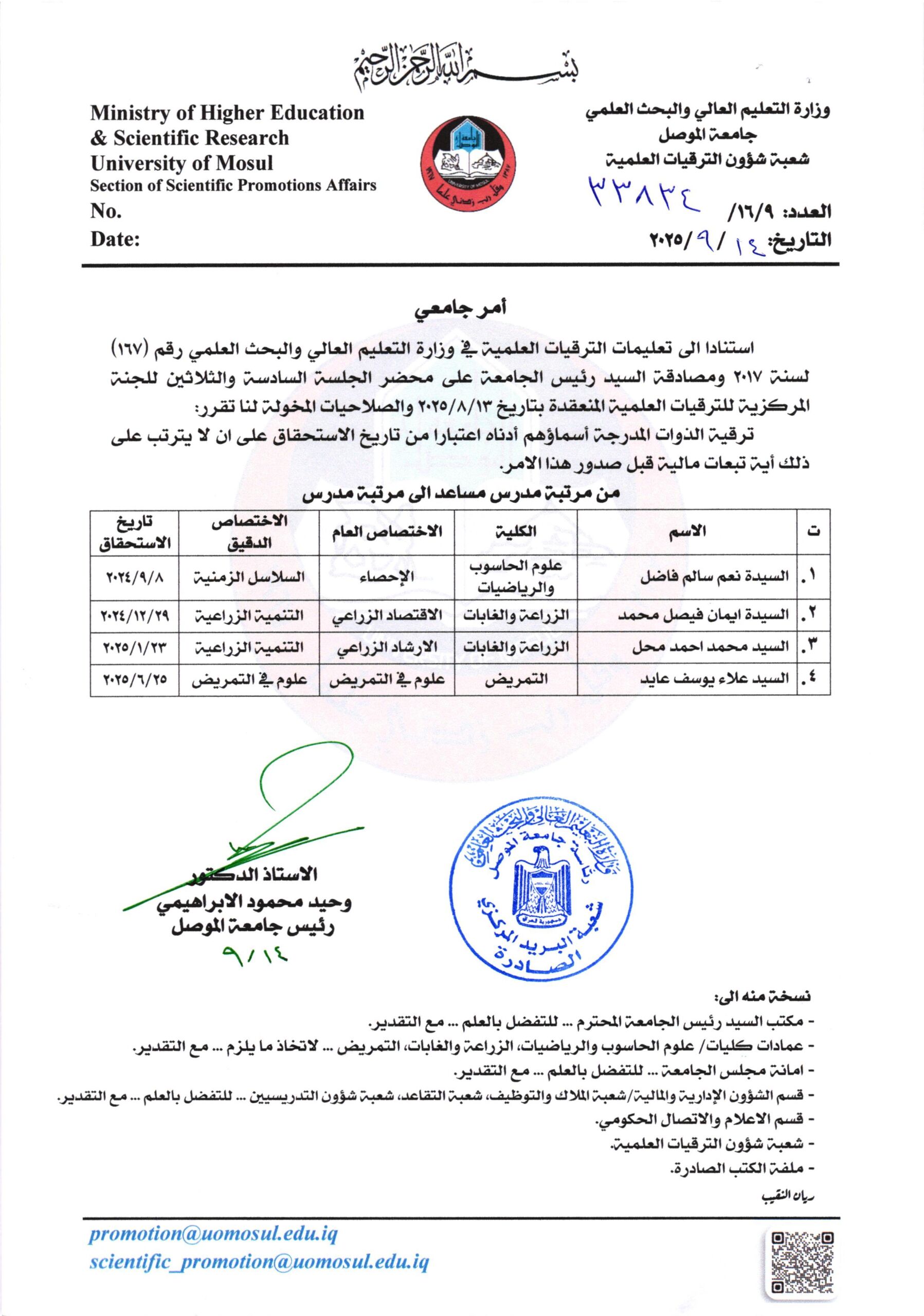 صدور الأوامر الجامعية لعدد من تدريسيي جامعتنا الى مرتبة أستاذ مساعد ومدرس