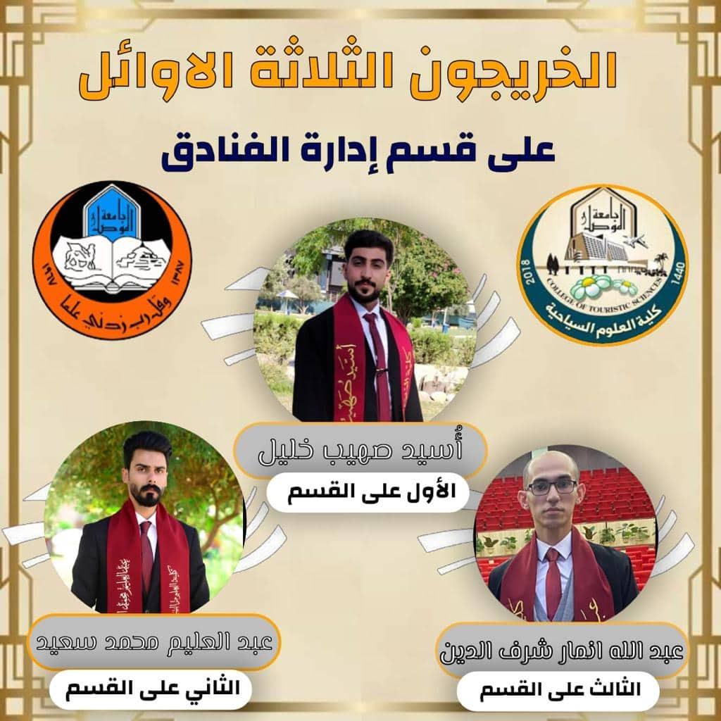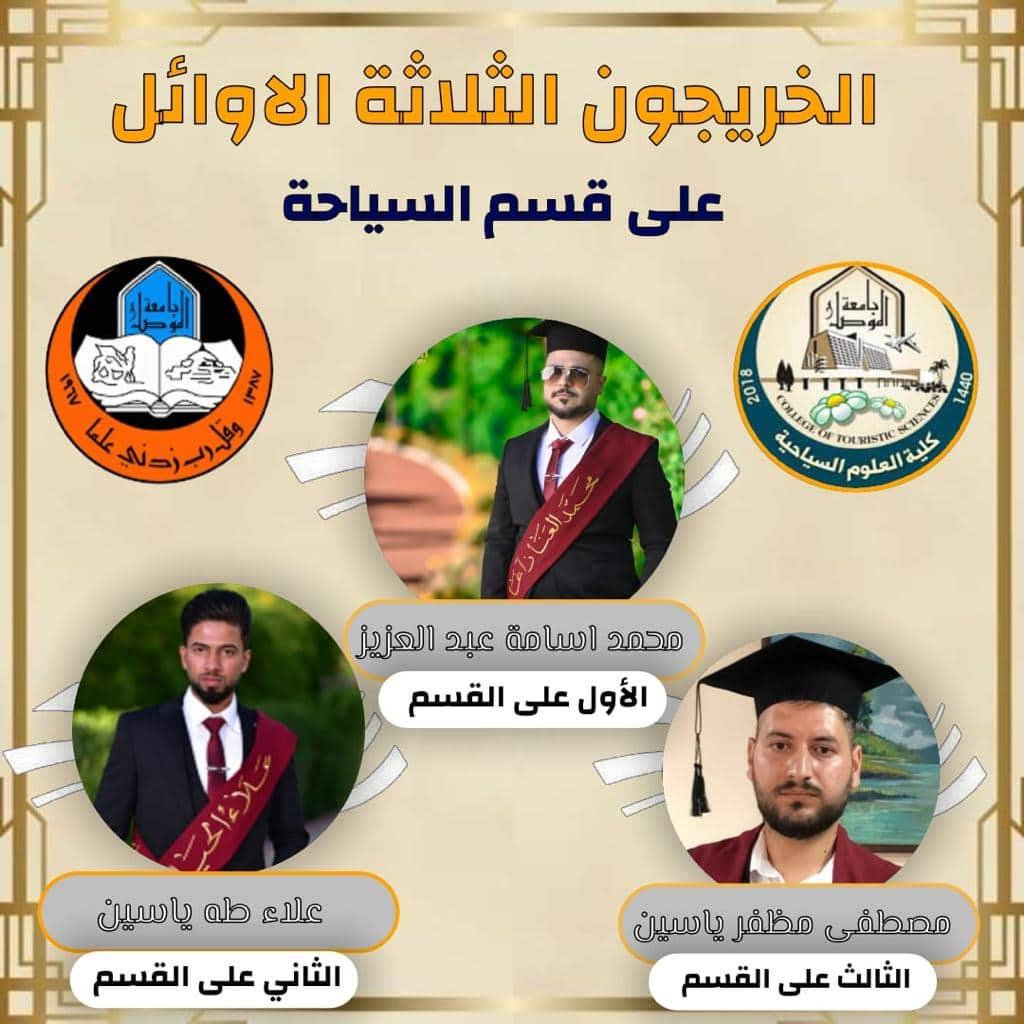 تتقدم عمادة كلية العلوم السياحية متمثلة بالسيد عميد الكلية الأستاذ المساعد الدكتور محمد نائف محمود ونيابة عن جميع كادرها التدريسي بوافر التهاني والتبريكات إلى الطلبة الأوائل للعام الدراسي (2021-2022) تثمينا لتميزهم وجهدهم في الحصول على المراتب الاولى بين اقرانهم ، ونبارك لعوائلهم الكريمة على قطفهم لثمار الجد والمثابرة متمنينَ لهم دوام التوفيق والنجاح في مسيرتهم العلمية.