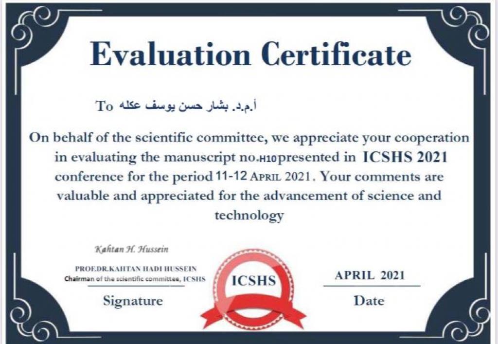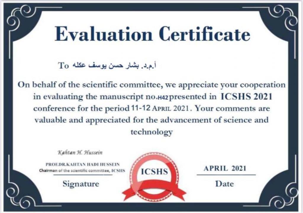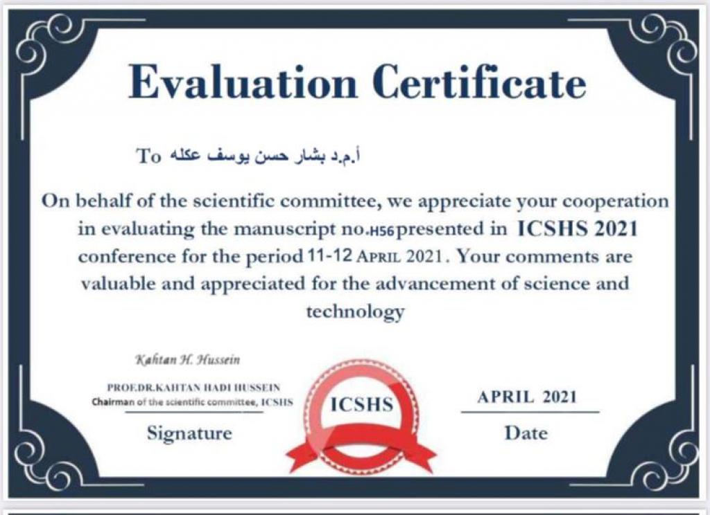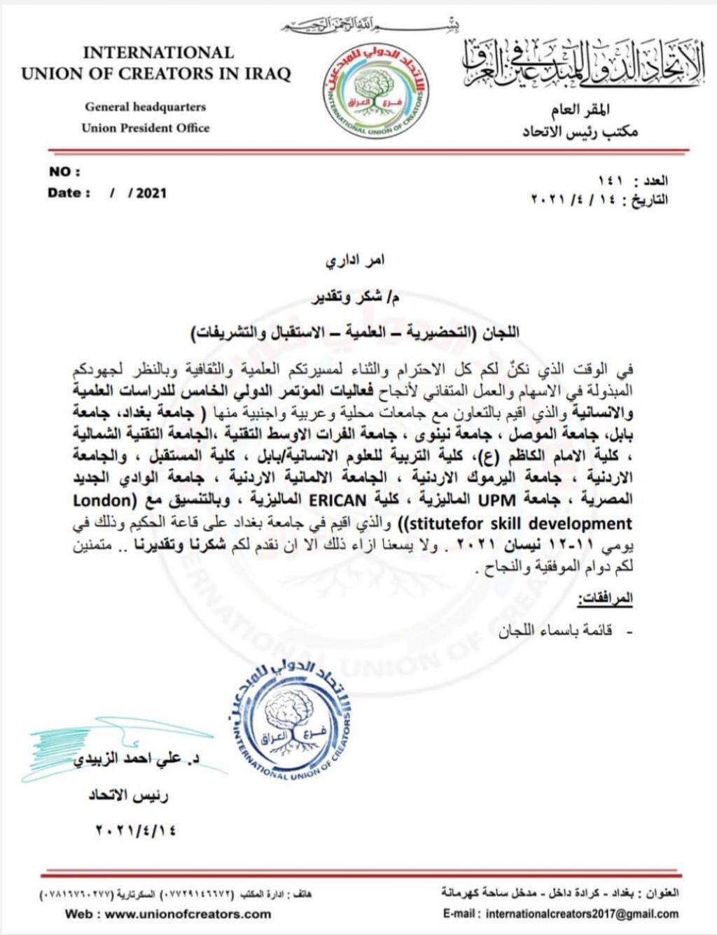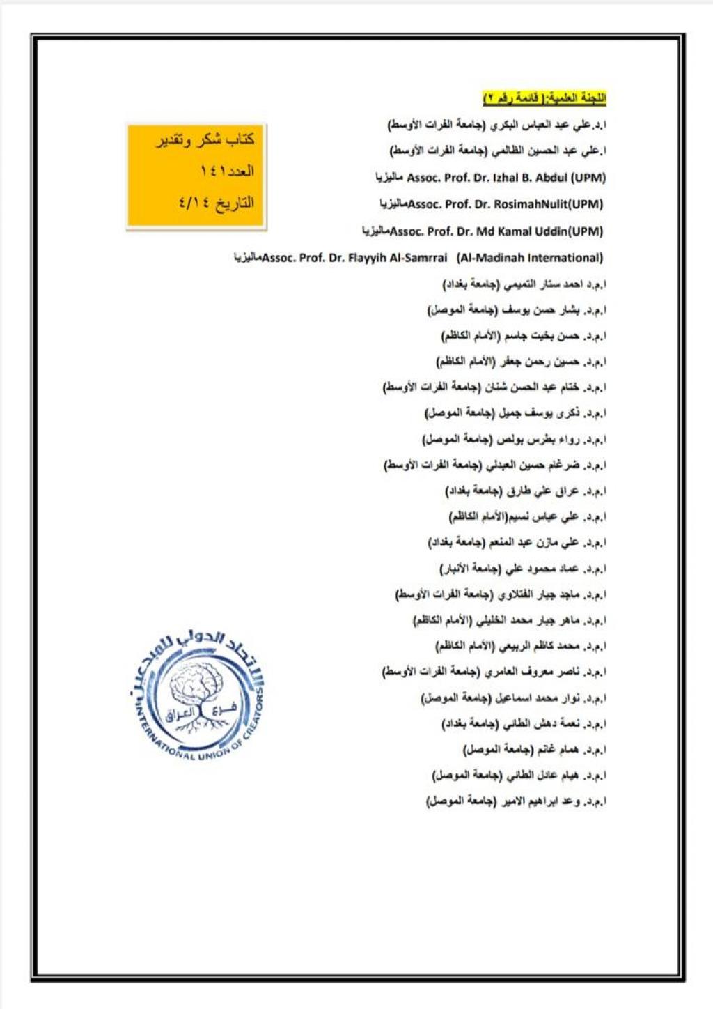 عميد كلية العلوم السياحية يحصل على كتاب شكر وتقدير من الاتحاد الدولي للمبدعين في العراق .