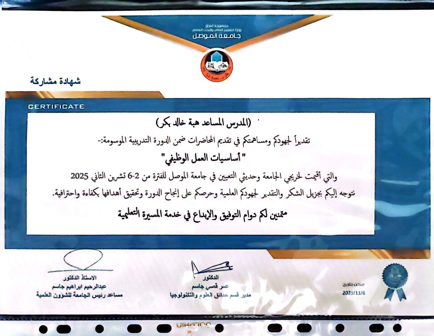 شاركت كلية العلوم السياحية في الدورة التدريبية الموسومة “أساسيات العمل الوظيفي”، التي نظمتها شعبة التأهيل والتوظيف والمتابعة في رئاسة جامعة الموصل، من خلال المحور الخاص بـ فن إتيكيت العمل الوظيفي، والذي قدمته المدرس المساعد هبة خالد بكر، مقرر قسم الدراسات الفندقية.