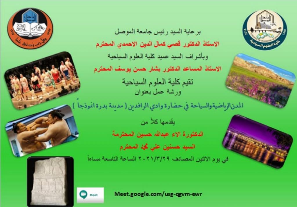 برعاية السيد رئيس جامعة الموصل الاستاذ الدكتور قُصي كمال الدين الاحمدي المحترم وبإشراف السيد عميد كلية العلوم السياحية الاستاذ المساعد الدكتور بشار حسن يوسف المحترم عقدت كلية العلوم السياحية يوم الاثنين الموافق ٢٩ / ٣ / ٢٠٢١ ورشتها العلمية الموسومة المدن الرياضية والسياحة في حضارة وادي الرافدين ( مدينة بدرة انموذجاً ) والقى محاضرات الورشة الاستاذ الدكتورة الاء عبدالله حسين والسيد حسنين علي محمد ، وشهدت الورشة مناقشات ومداخلات علمية من قبل المشاركين وجاء التأكيد على اهمية رياضة المصارعة في الحقبة السومرية وظهورها في مدينة بدرة بمحافظة واسط وانتقالها الى الصين واليابان باسم (سومو) ، وخرجت الورشة بدعوات لضرورة الاستفادة من الاماكن الاثارية في مدينة بدرة وتشجيع السياحة الاثارية فيها .