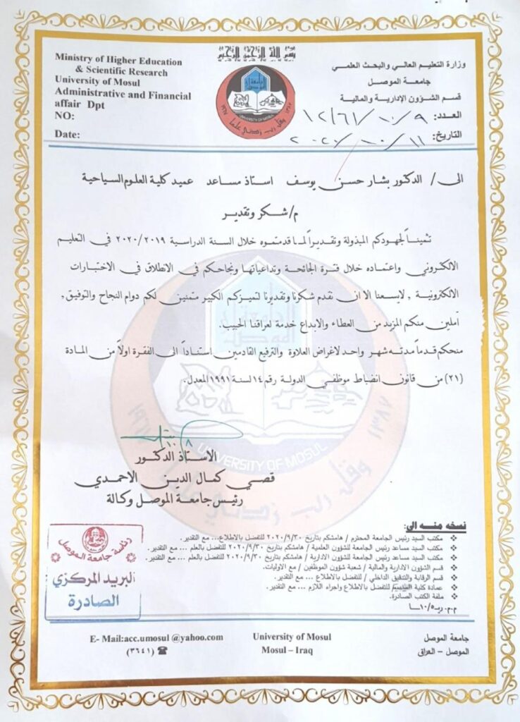 على بركة الله عقد مجلس كلية العلوم السياحية الجلسة الاولى للعام الدراسي ٢٠٢٠- ٢٠٢١ ، برئاسة السيد عميد الكلية الاستاذ المساعد الدكتور بشار حسن يوسف عكله وحضور السادة اعضاء المجلس يوم الاحد الموافق ١١ / ١٠ / ٢٠٢٠ ، وبدأ السيد العميد بالترحيب بالسادة الاعضاء وتعميم توجيهات السيد رئيس الجامعة الاستاذ الدكتور قصي كمال الدين الاحمدي المحترم المتضمنة الالتزام بالدوام الرسمي وفق ما اقرته خلية الازمة الموقرة وبواقع ٥٠ % مع الاخذ بالاحتياطات الصحية الوقائية اللازمة، واكمال جميع المستلزمات الخاصة باستقبال الطلبة في العام الدراسي الجديد وفق نظام التعليم المدمج . والاهتمام بالمناهج الدراسية وتشجيع المشاريع البحثية في مستودعات (سكوبس).ثم انتقل المجلس بعدها لمناقشة الفقرات المثبتة على جدول اعماله ومنها :-1. تحديد مجالس الاقسام العلمية .2. تشكيل اللجان الدائمية في الكلية.3.المصادقة على النتائج الامتحانية للدور الثاني.4. عرض محاضر الاقسام العلمية على المجلس وتم اتخاذ القرارات المناسبة بشأن فقرات المحاضر.5. توزيع المواد الدراسية على الكادر التدريسي.في الختام نتمنى التوفيق لكليتنا وجامعتنا الموقرة لخدمة لأعزائنا الطلبة ومدينتنا العزيزة .
