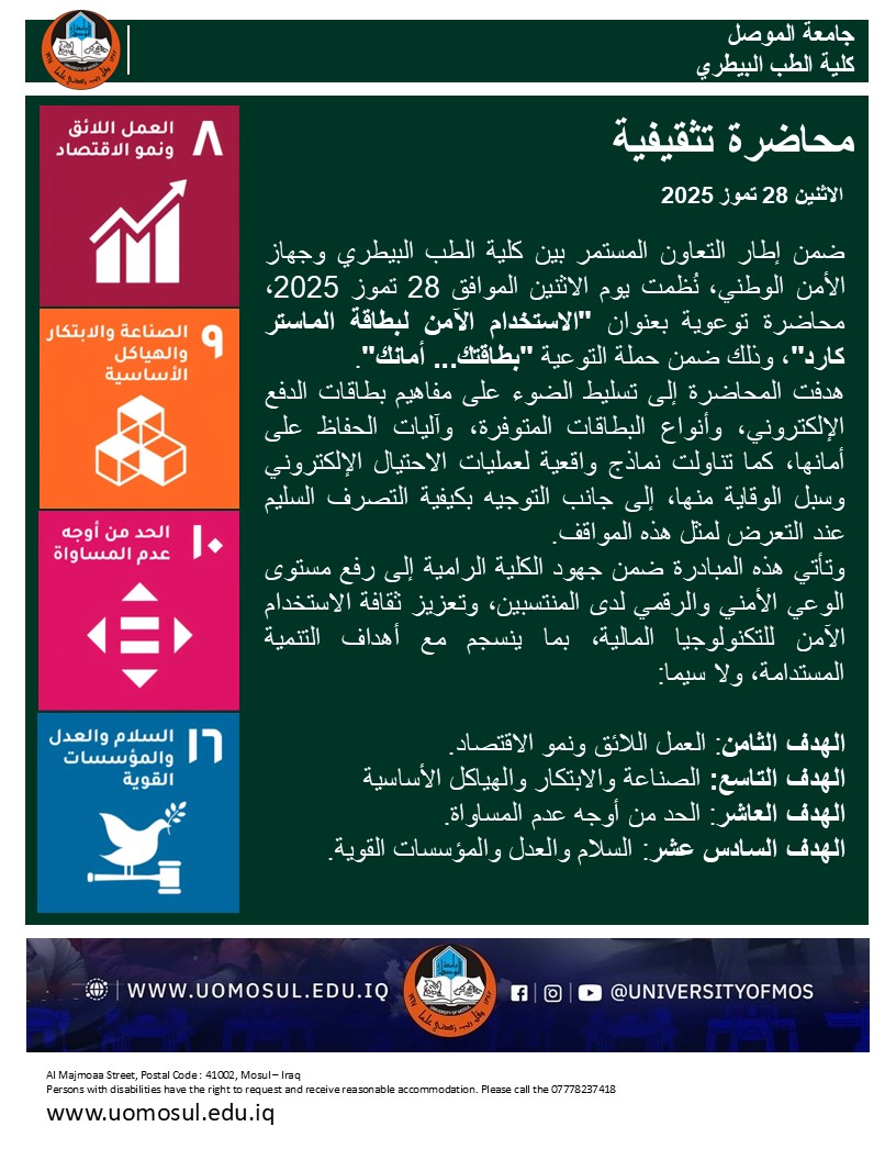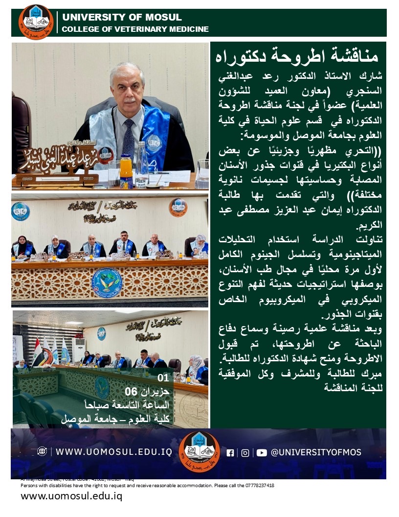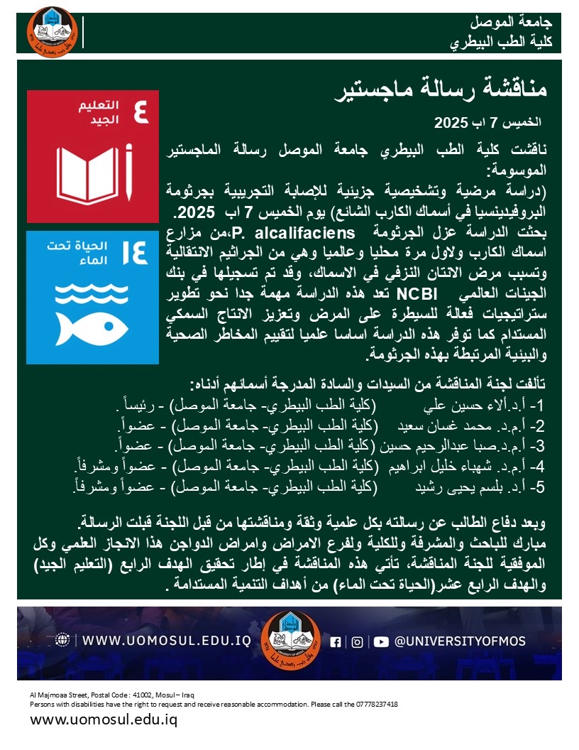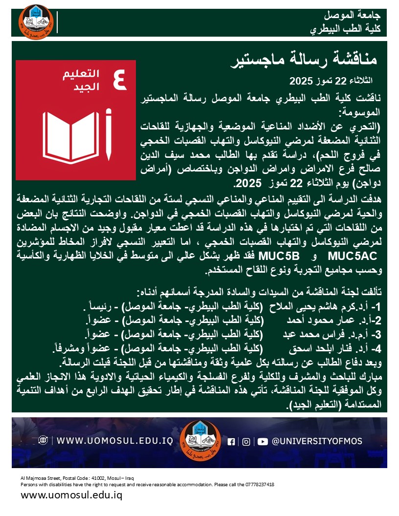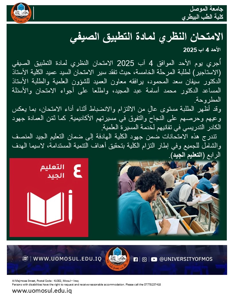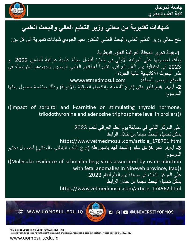نرحب بكم اجمل ترحيب في الموقع الالكتروني لكلية الطب البيطري في جامعة الموصل متمنين ان تجدوا فيه ماينفعكم من المعلومات و البيانات والنشاطات المتعلقة بالكلية . تأسست كلية الطب البيطري في 9 نيسان 1976 وهي احدى الكليات العلمية في جامعة الموصل، تهدف الكلية الى تخريج اطباء بيطريين ذو كفاءة عالية لمواجهة الامراض التي تفتك بالثروة الحيوانية والسيطرة على الامراض الانتقالية التي تصيب الانسان، وكذلك لعب دور مهم في الكشف عن اللحوم من خلال الاشراف على المجازر فضلاً عن تحسين البيئة التي يعيش بها الانسان والحيوان، إذ قامت كلية الطب البيطري بتخريج المئات من الاطباء البيطريين العاملين في المستشفيات البيطرية في عموم العراق فضلا ً عن اقسام الثروة الحيوانية التابعة لوزارة الزراعة، فضلاً عن العديد من الاطباء البيطريين العاملين في القطاع الخاص. إقرأ المزيد