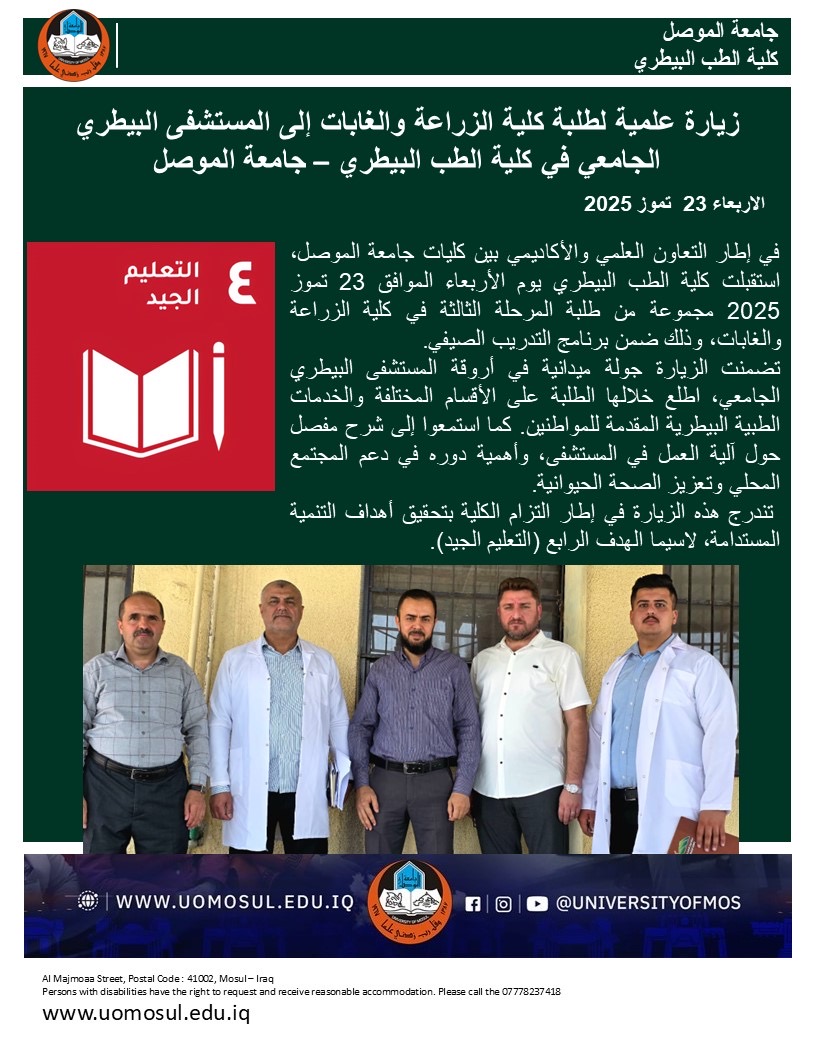 تأسست كلية الطب البيطري / جامعة الموصل عام 1976 ، وتهدف الى تهيئة ملاكات علمية متخصصة في علوم الطب البيطري، حيث تعمل على المساهمة في وقاية الحيوانات من الأمراض وتشخيص الأمراض وعلاجها وفي الحفاظ على الثروة الحيوانية وتنميتها وزيادة كفاءتها الإنتاجية. المساهمة في مجالات الصحة العامة ذات العلاقة بمكافحة الأمراض المشتركة بين الحيوان والإنسان ومراقبة الأغذية ذات المنشأ الحيواني. فضلاً عن عمل الخريجين في المعاهد ومراكز البحوث ذات العلاقة ومؤسسات الصناعات الغذائية والمنتجات الحيوانية. إقرأ المزيد