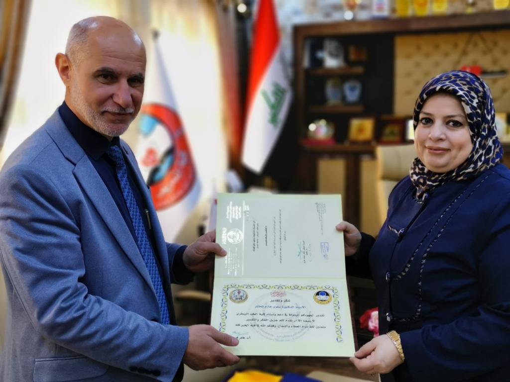 درع الكلية وشهادة تقديرية مقدمين من السيد عميد كلية الطب البيطري الى السيدة عميد كلية التمريض