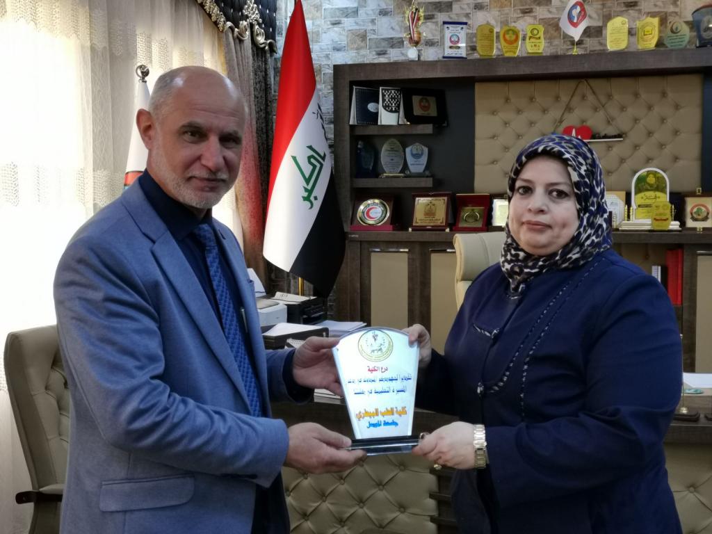 قدم السيد عميد كلية الطب البيطري الاستاذ الدكتور ظافر محمد عزيز درع كلية الطب البيطري وشهادة تقديرية بالاضافة الى كتاب شكر وتقدير الى السيدة عميد كلية التمريض الاستاذ الدكتورة سلوى حازم المختار وذلك تثميناً لما قدمته عمادة كلية التمريض من دعم للمسيرة العلمية في كلية الطب البيطري.جاء ذلك خلال زيارة رسمية قامت بها عمادة كلية الطب البيطري متمثلة بالسيد عميد الكلية والسادة المعاونين العلمي والاداري وقد كان في استقبالهم السيدة عميد كلية التمريض والسيد معاون العميد للشؤون الادارية.